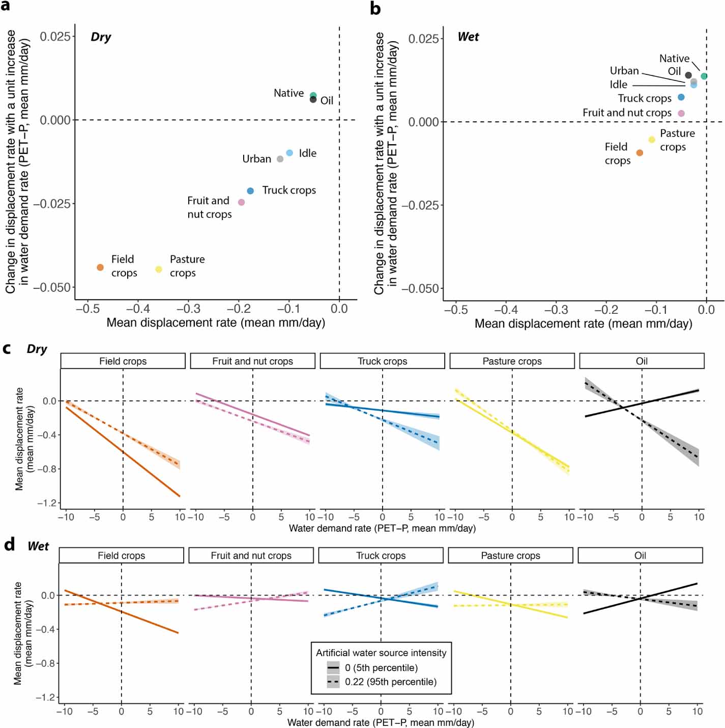 Our analysis proceeds in three parts. First, we evaluate how displacement dynamics are differentiated by land cover. We provide summary statistics of displacement for different land cover types for the entire study period, and wet and dry year periods separately. We also calculate the correlation between displacement and water demand rates at the grid cell level across the full study region, which identifies unique temporal dynamics of displacement and water demand within areas with either strong positive or negative correlation, and identifies the land cover types that generate those dynamics. See Supplementary Text S3.1 for details.