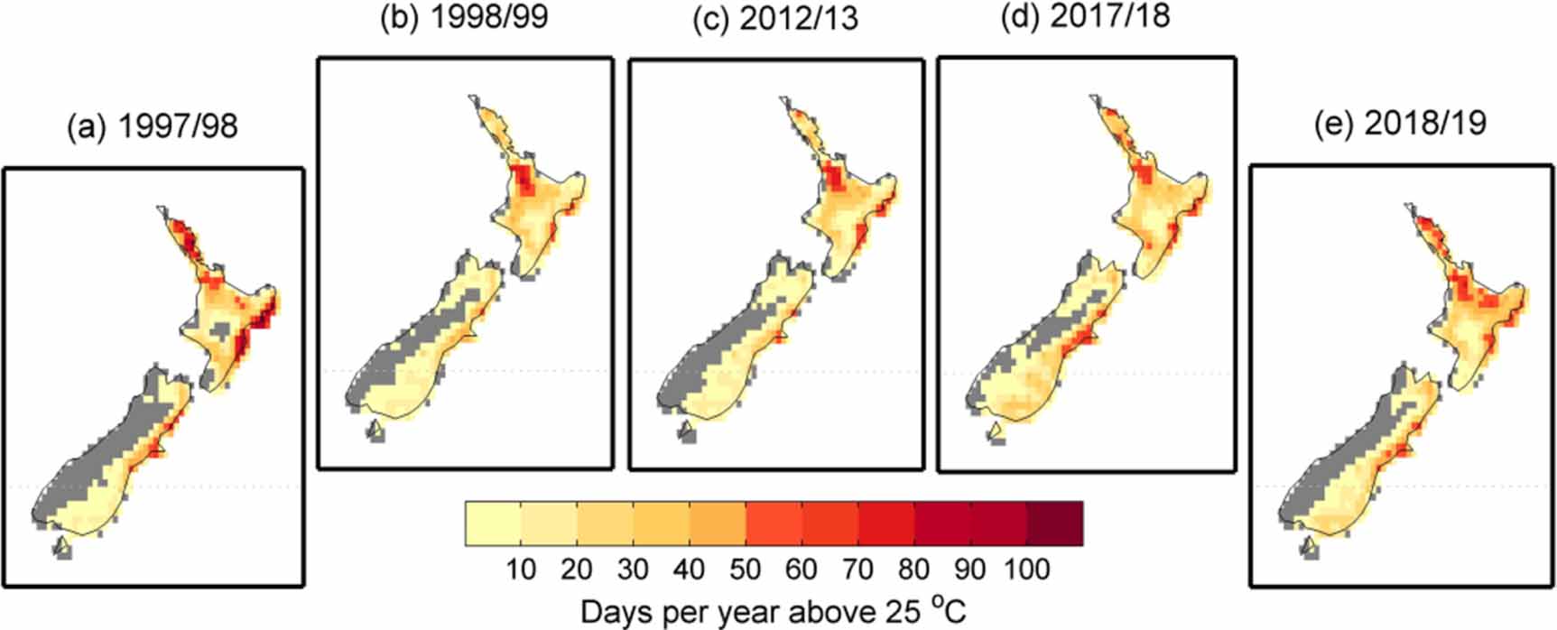 Figure 1. Number of days per year, spanning the period July 1–June 30, when daily maximum temperatures exceeded 25 °C, for five selected hot years in New Zealand. Grey areas indicate no days were observed with temperatures exceeding 25 °C.
