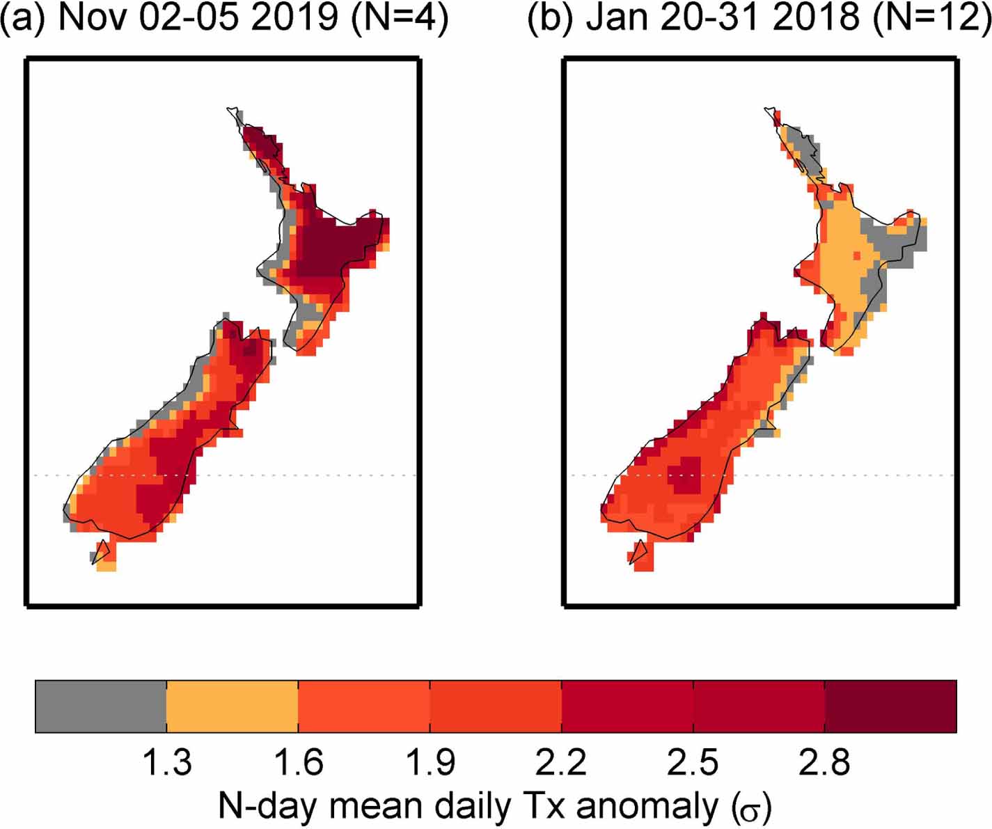Figure 5. Local Tx anomalies for the top two heatwaves experienced in New Zealand since 1979. Daily Tx data are averaged over (a) the 4-d period from November 02-05 2019, and (b) the 12-d period from January 20–31 2018. The colour scales also align with corresponding percentile thresholds: the yellow colours denote exceedances of the 90th percentile, the orange colours denote exceedance of the 95th percentile, and darker red colours denote exceedances of the local 99th percentiles for the entirety of the N-day heatwave period.