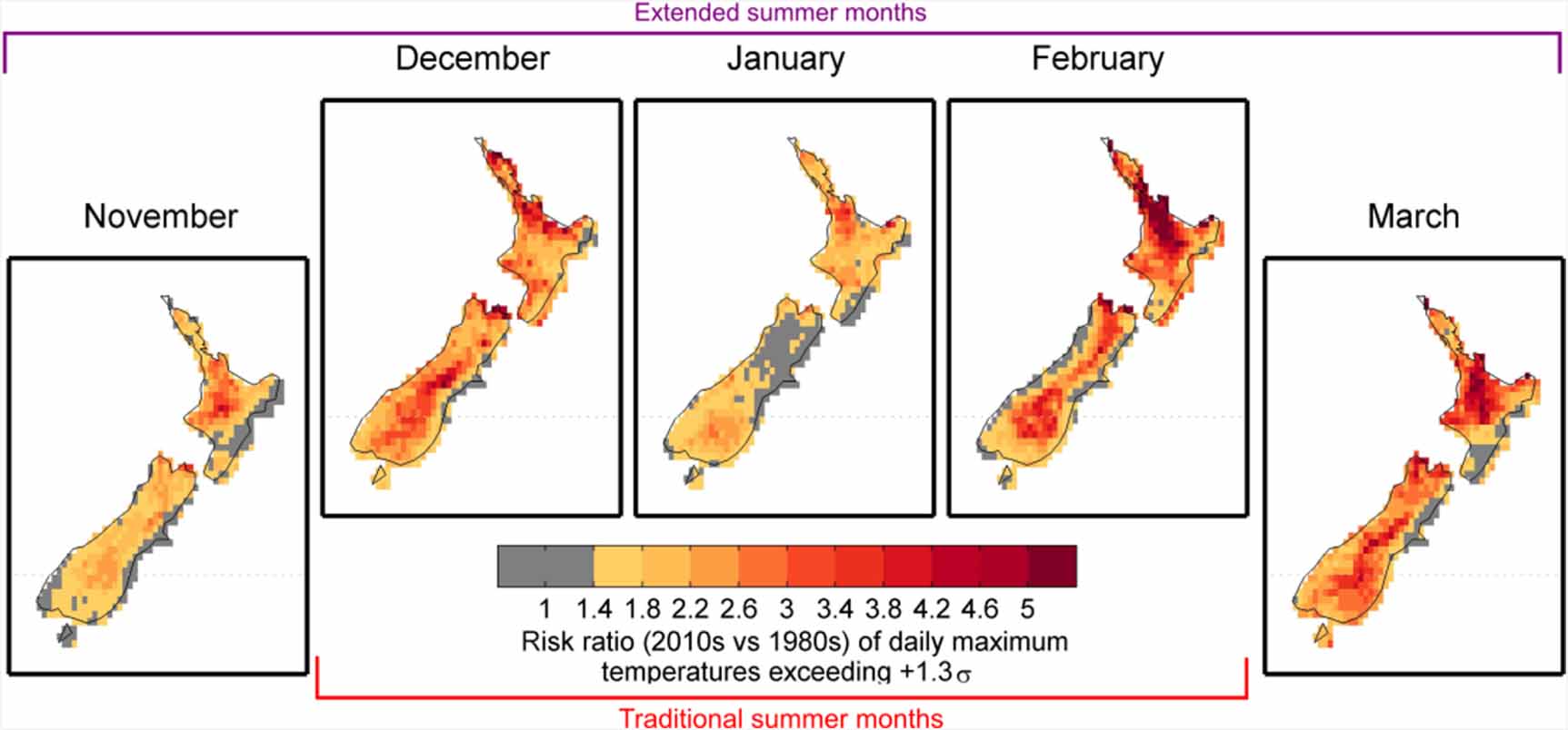 While acknowledging the caveats surrounding the risk ratios of figure 5, these results show that New Zealand may be witnessing an effective lengthening of summertime conditions over the last several decades. Such results are supported by separate research showing an attributable increase in the likelihood of North Island droughts over the twentieth century (Harrington et al 2016). While further analysis under a formal statistical framework (Stone et al 2019) is needed to verify these results, decision makers and stakeholders should nevertheless prepare for similar trends to accompany future increases in global temperatures.