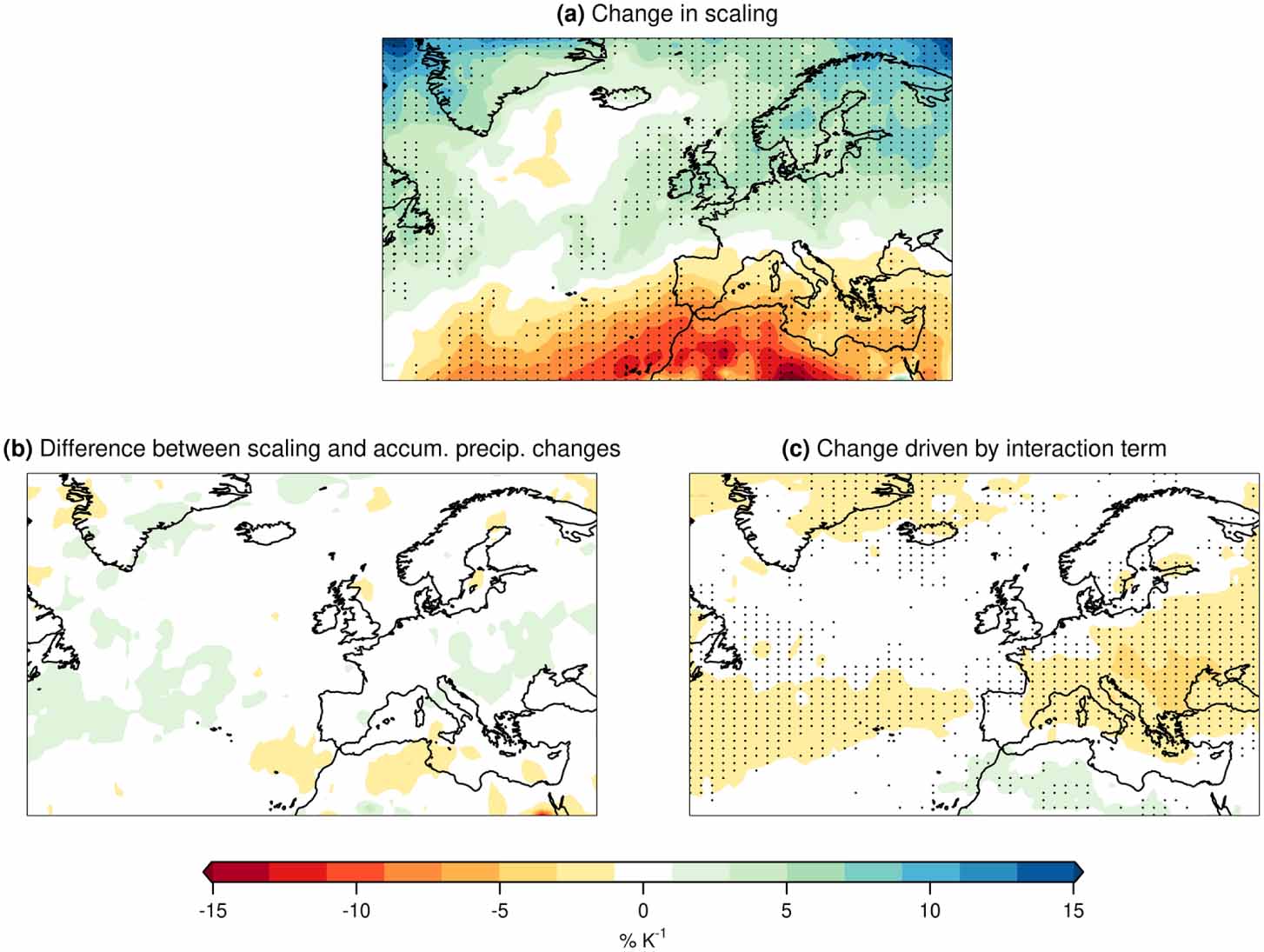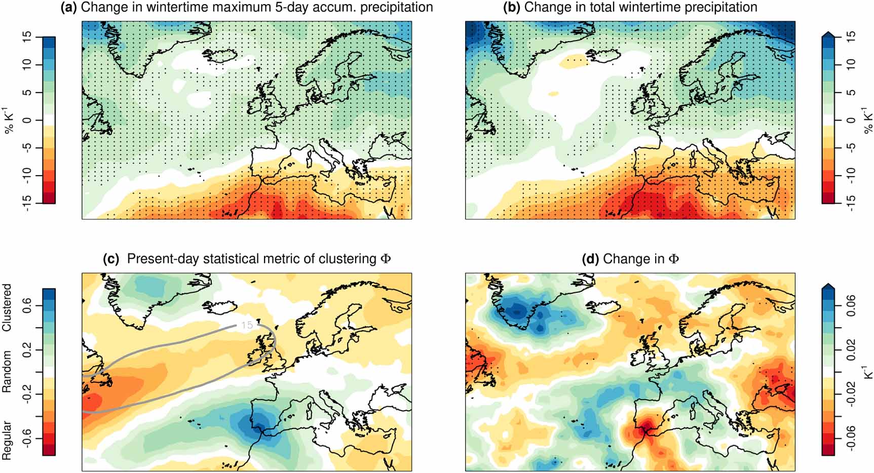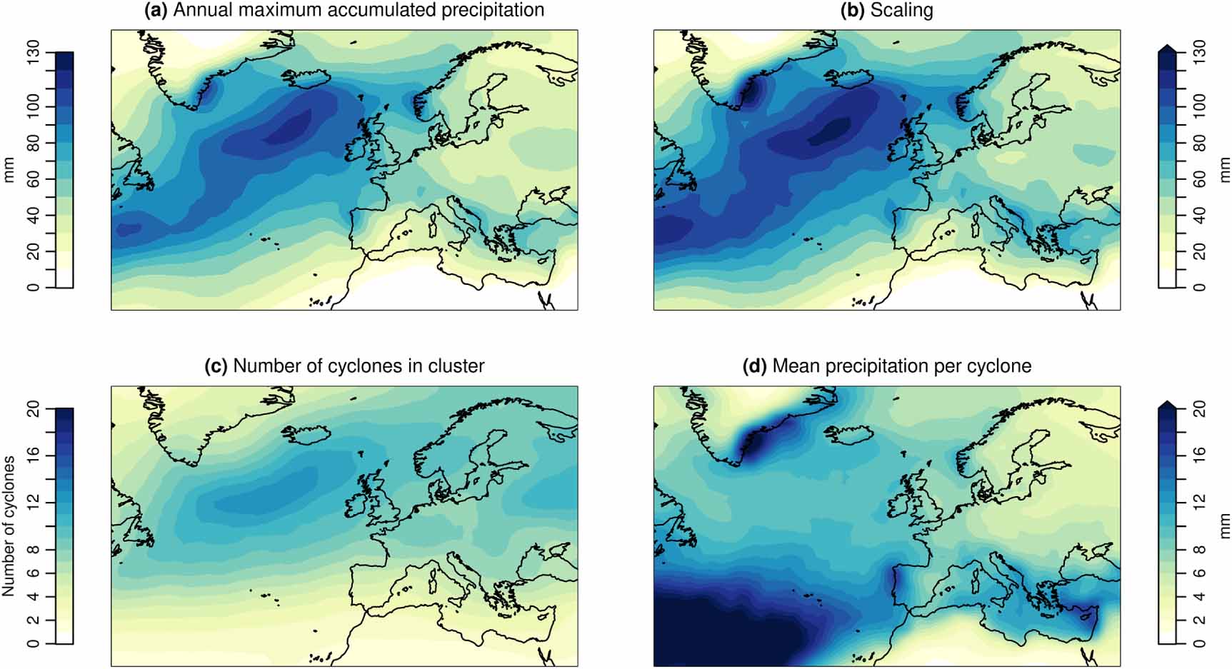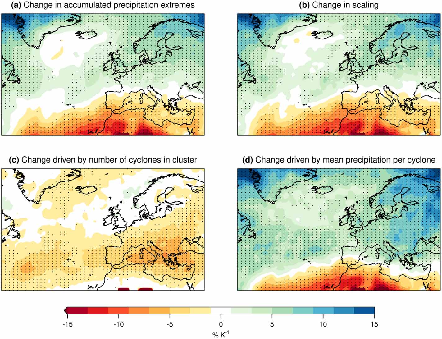 We apply a physically-based scaling that allows for decomposing and understanding the changes of wintertime (December–February) accumulated precipitation extremes from cyclone clustering projected by climate models.