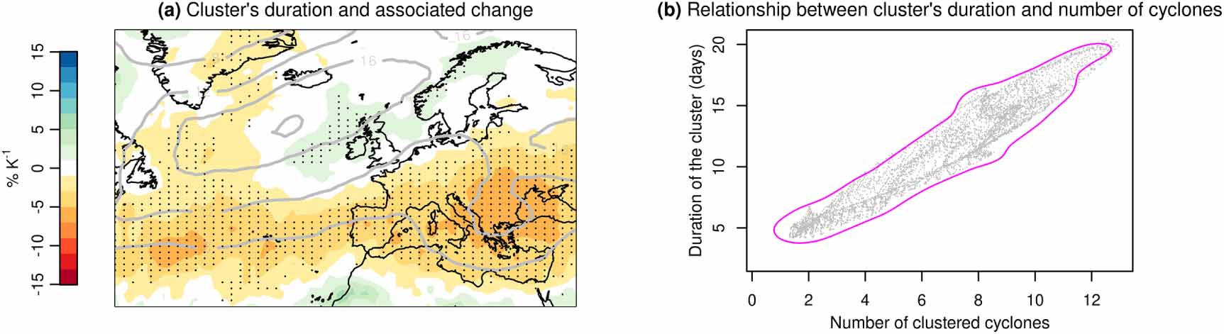 Standard image High-resolution imageFigure B4. Duration of clustered cyclones and associated future changes. (a) Multimodel mean duration of cyclone clusters leading to annual maxima of accumulated precipitation during the past (1975–2004; grey contours) and associated percentage changes per degree of global warming (%/K) between future (2081–2098) and past periods (shading). Stippling indicates locations where at least 80% of the models agree on the sign of the changes. (b) Relationship between the multimodel mean average duration of the clusters leading to annual maxima accumulated precipitation (1975–2004; based on climatology shown with grey contours in panel (a)) and the associated number of clustered cyclones (based on figure 2(c)). Each location is represented by a dot in the scatterplot; the magenta contour is the isoline of the kernel density containing 90% of the pairs.