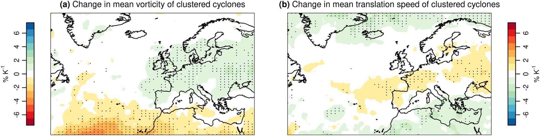 Standard image High-resolution imageFigure B6. Future changes in the intensity and translation speeds of the clustered cyclones. Multimodel mean percentage changes per degree of global warming (%/K) in mean (a) relative vorticity and (b) translation speeds of cyclones within the clusters leading to annual maxima of accumulated precipitation. Stippling indicates locations where at least 80% of the models agree on the sign of the changes. Changes are between future (2081–2098) and past (1975–2004) climates.