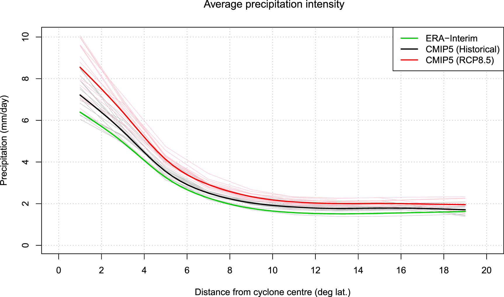 We employ simulations [22] from models of the Coupled Model Intercomparison Project Phase 5 (CMIP5), i.e. BCC-CSM1-1, BCC-CSM1-1-m, CCSM4, CMCC-CM , GFDL-CM3, GFDL-ESM2G, GFDL-ESM2M, INMCM4, IPSL-CM5A-LR IPSL-CM5A-MR, MIROC5, MIROC-ESM, MIROC-ESM-CHEM, MRI-CGCM3, NorESM1-M (r1i1p1 for all models, but r6i1p1 for CCSM4). We also use data from ERA-Interim reanalysis [23] to evaluate the fidelity of the CMIP5 models for the purpose of the study. The precipitation rate associated with the 6-hourly time steps of the cyclone tracks was derived from the 3-hourly precipitation rate averaged over the three hours before and after the cyclone time step of interest. For CMIP5 models, precipitation is obtained for the past during 1975–2004, and for the future during 2081-2098; the latter period is shorter because of the limited data availability of CMIP5 output for 3-hourly precipitation [19]. For ERA-Interim, we analyse the period 1979–2008, given that this dataset is available from 1979 onward.