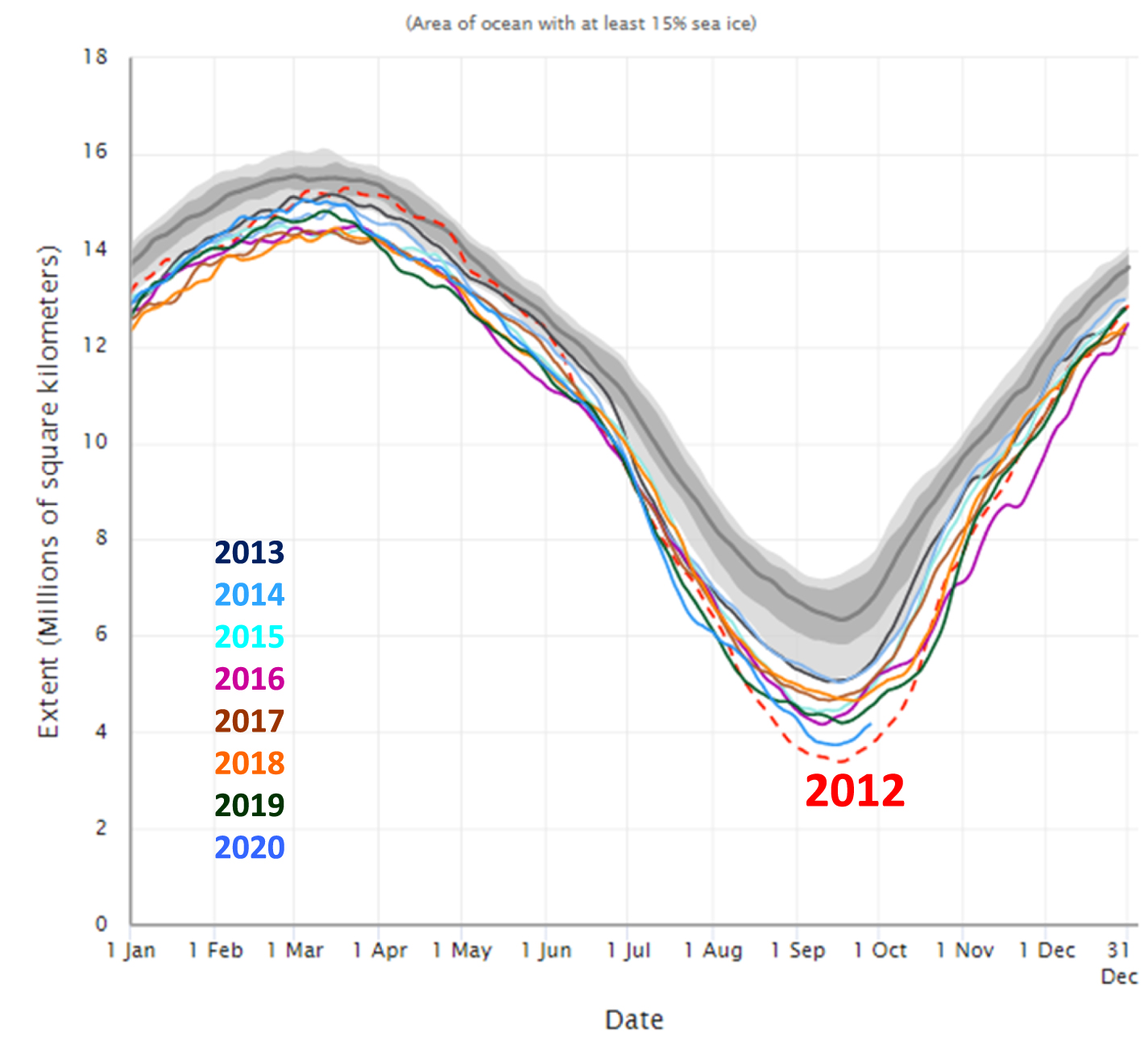 Figure 2. Annual cycle of Arctic sea-ice extent (area with >15% ice concentration). Red dashed line is for 2012, other colored lines are for years from 2013 to 2020, dark gray line is the median for 1981–2010 with dark (light) shading indicating the interquartile (interdecile) range. Created using data from NSIDC: https://nsidc.org/arcticseaicenews/charctic-interactive-sea-ice-graph/, Fetterer et al. (2017).