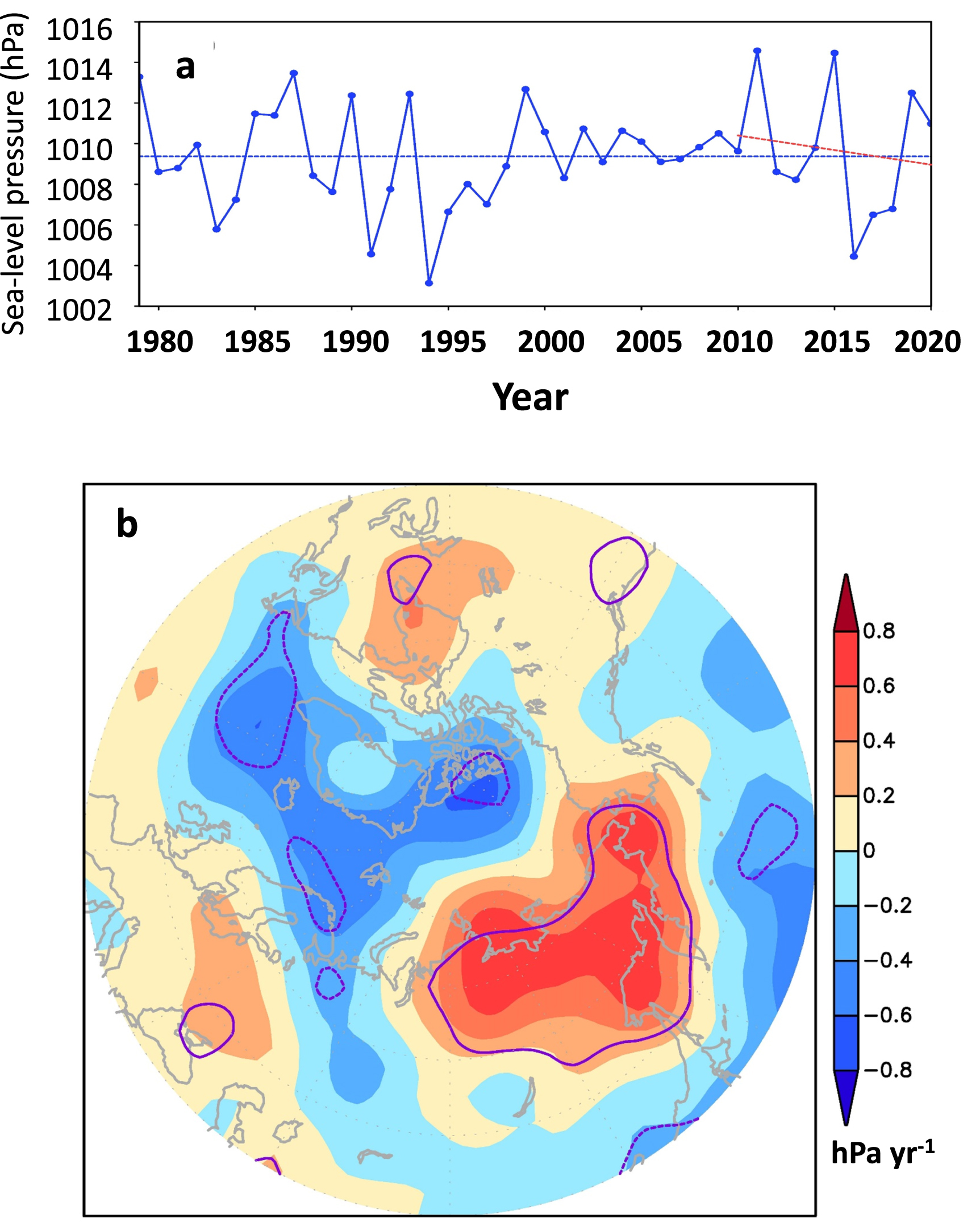 Standard image High-resolution imageFigure 3. (a) Timeseries of SLP [hPa] during August 1980–2020 north of 70°N. Dashed blue line denotes the mean, and the red dashed line represents the trend from 2010 to 2020. (b) Spatial distribution of trends in August SLP from 2010 to 2020 [hPa yr−1], with purple contours indicating significance >90% confidence. Data are from the NCEP/NCAR reanalysis.