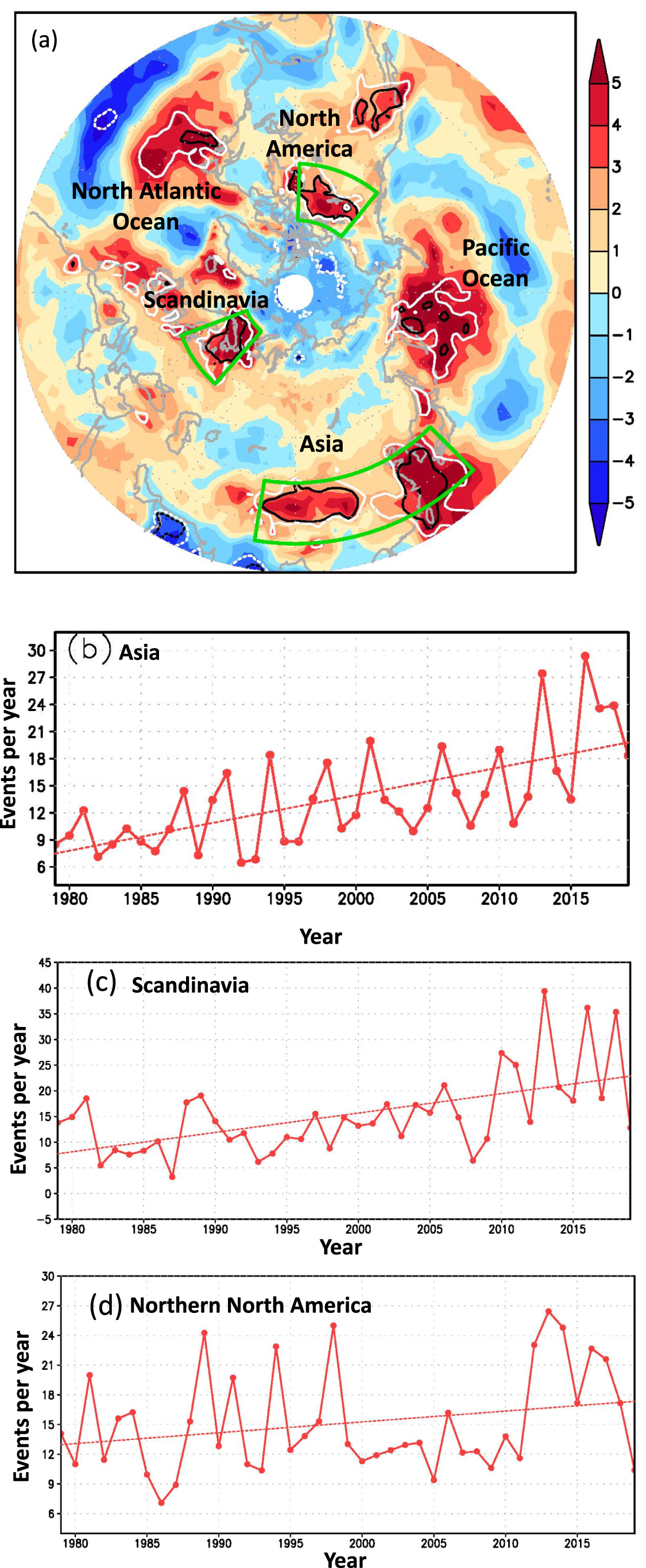 Figure 6. (a) Frequency of heatwaves (daily SATs > 1 standard deviation) during summers of 1979–2019 regressed onto PC2. White and black contours denote 95% and 99% confidence levels. Time series of heatwaves in regions denoted by green boxes in (a) for East Asia (b, p < 0.01), Scandinavia (c, p < 0.01), and northern North America (d, p < 0.1). Units are events per year.
