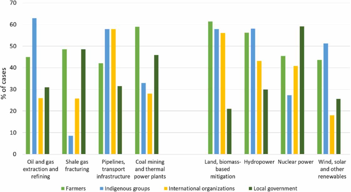 Standard image High-resolution imageThe first group is rural communities, including those dependent on rural livelihoods such as farmers, peasants and fishers. Most power plants, mines, gas drilling sites, wind turbines and dams are in rural areas, as are the farms and forests that provide the materials for biomass production. Roughly 71% (n = 459) of cases are located rurally, with this rising close to 90% for biomass (n = 51) and hydropower (n = 143), and from 60%–80% for oil and gas extraction (66%, n = 79), FF and pipeline infrastructure (68%, n = 26) and coal extraction (76%, n = 35) and other renewables (79%, n = 31). Only 6.4% (n = 41) of cases are deemed urban and 5% unclassified. The conflicts that tend to be least rural include oil and gas refining, nuclear and coal power plants and fracking, located primarily in semi-urban/suburban areas. While the local impacts for both carbon intensive FF extraction and renewables are located in rural areas, most energy consumption occurs in urban areas.