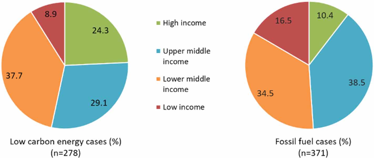 Distribution of conflicts according to country income groups (based on Gross National Income per capita, as defined by the World Bank) was as follows: High income (n = 119), Upper Middle Income (n = 217), Lower middle (n = 240) and Low income (n = 78). Whereas both FF and LCE had from 65%–70% of their cases in middle income countries, FF cases occurred more in high income countries (24.3%), and a higher proportion of the LCE cases were located in low income countries (16.5%), with only 10% in high income countries (See graph 3). This is firstly attributed to a boom in dam construction, nuclear and carbon offset programs in the Global South due to more existing installed capacity in the North. Proponents' rationale for carbon offsets is that paying for greenhouse reductions elsewhere is cheaper and easier than domestic reductions. Yet activists, NGOs and academics have decried offsets as 'carbon colonialism' (Bumpus and Liverman 2011), pointing to controversial local impacts and dubious claims regarding mitigation and additionality. Our findings support caution about displacement of the social and environmental costs of decarbonization from North to South and towards the peripheries of industrialized countries. Improved regulatory regimes and more secure land tenure in developed economies are another reason for the reduced conflictivity of LCE projects in higher income countries, as land grabbing and displacement is a prime driver of conflict in these projects in low income countries.