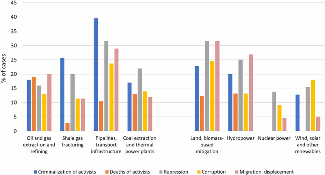 This paper maps and presents mobilizations on FF and LCE projects for the first time, drawing from the largest empirical dataset on the subject currently available. We find that place-based movements are succeeding in curbing both fossil-fuel and low-carbon energy projects. Over a quarter of projects encountering social resistance have been shelved, suspended or delayed. The evidence highlights that low carbon, renewable energy and mitigation projects are almost as conflictive as FF projects, (30% of FF conflicts and 26% of LCE projects are high intensity) and that both project types particularly impact vulnerable groups such as rural communities and Indigenous peoples; Indigenous peoples are involved in 58% of the cases analyzed. Amongst LCE projects, hydropower was found to be particularly socially and environmentally damaging, leading to mass displacement and large-scale eco-system transformation. Incidents of repression or violence against protesters and land defenders occurred in one third of cases, with violent responses most common in hydropower, biomass, pipelines and coal extraction conflicts. Ten per cent of all cases involved assassination of activists. Wind, solar, and geo-thermal renewable energy projects were the least conflictive and entailed lower levels of repression than other projects.