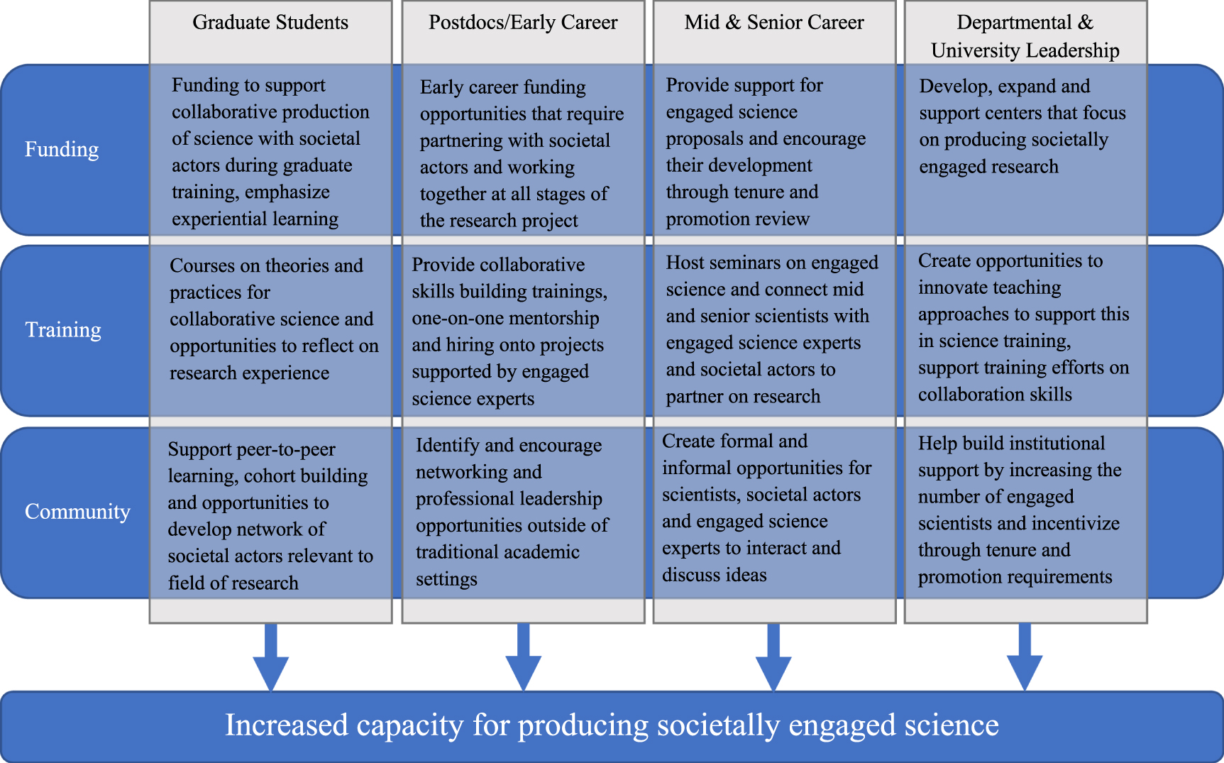 We recognize more work needs to be done to support scientists at different career stages, which could include mentoring programs, training opportunities, facilitating introductions with non-academic partners and other types of support. As our interventions at these career stages continue, we expect to see faculty become more successful in receiving external funding from programs that emphasize societal impacts and to see broader participation in university engagement efforts like Carnegie Community Engagement Classification or The Times Higher Education impacts rankings 8 .