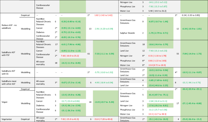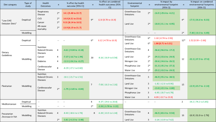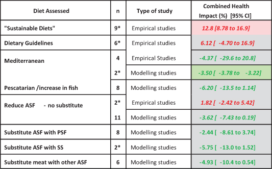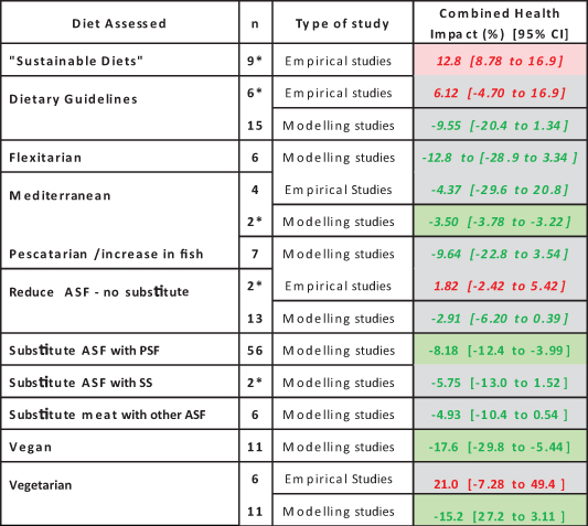 'Sustainable diets' were reported to improve health outcomes in 87% (n = 151) of the included measurements. In modelling studies, vegan diets and diets in which there was a degree of replacement of ASF with PSF had the largest effect on combined health outcomes (−13.9% [95% CI −22.7 to −5.2] and −7.3% [95% CI −11.1 to −3.6 respectively] that was broadly consistent across individual health outcomes. Author-defined 'sustainable diets' (labelled as 'low GHG emission diet') was the only category for which a significant worsening of health outcomes was identified (+12.8% [95% CI +8.78 to +16.9]), however this was based on a very small number (x = 2) of papers. Findings from modelling and empirical studies were typically not concordant.