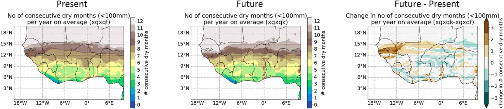 Figure 2. Average number of consecutive months with < 100 mm rainfall ('dry months') in a present climate UPSCALE simulation (left), a future climate UPSCALE simulation (middle) and the change (right).