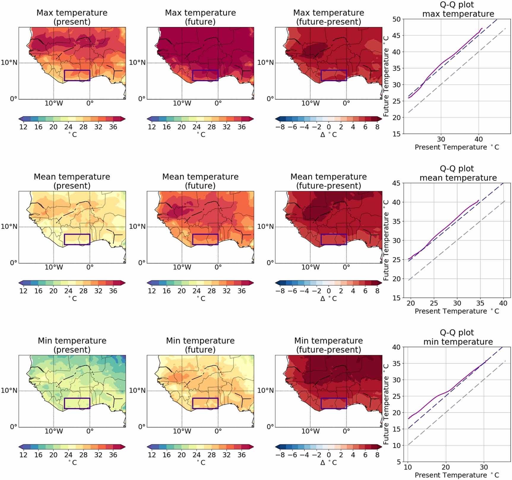 Figure 3. Comparison of temperatures from present climate and future climate UPSCALE simulations: daily maximum temperature (top row), daily mean temperature (middle row) and daily minimum temperature (bottom row). The first column shows temperature from the present climate UPSCALE simulation, the second column shows temperature from the future climate UPSCALE simulation, the third column shows the change. The furthest right column contains QQ plots comparing the temperature distribution under present climate and future climate UPSCALE simulations; the grey dotted line represents a 1:1 relation, the blue dashed line shows a 1:1 + 5 °C relation. The region used for the QQ plots (7°W–0°W, 5.1°N–8°N) is shown in the first 3 columns.