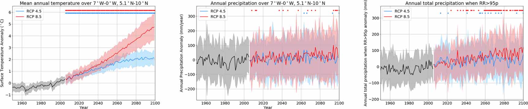 Standard image High-resolution imageFigure 4. Change in temperature and precipitation through time: Timeseries of mean annual temperature (left) and mean annual precipitation (middle) and annual total precipitation when the rainfall rate is over the 95th percentile (right) from 29 CMIP5 models over 1950–2100 over 7°W–0°W,5.1°N–10°N. The black line/grey shading shows the mean and standard deviation for each year across the 29 models for the historical simulation; the blue and red lines/shading are for RCP4.5 and RCP 8.5 respectively. The anomalies are calculated relative to 1986–2005. The dots indicate when the range of values from 29 models for that year is significantly different from the range for 1986–2005 at the 5% level, using a Mann–Whitney U test.