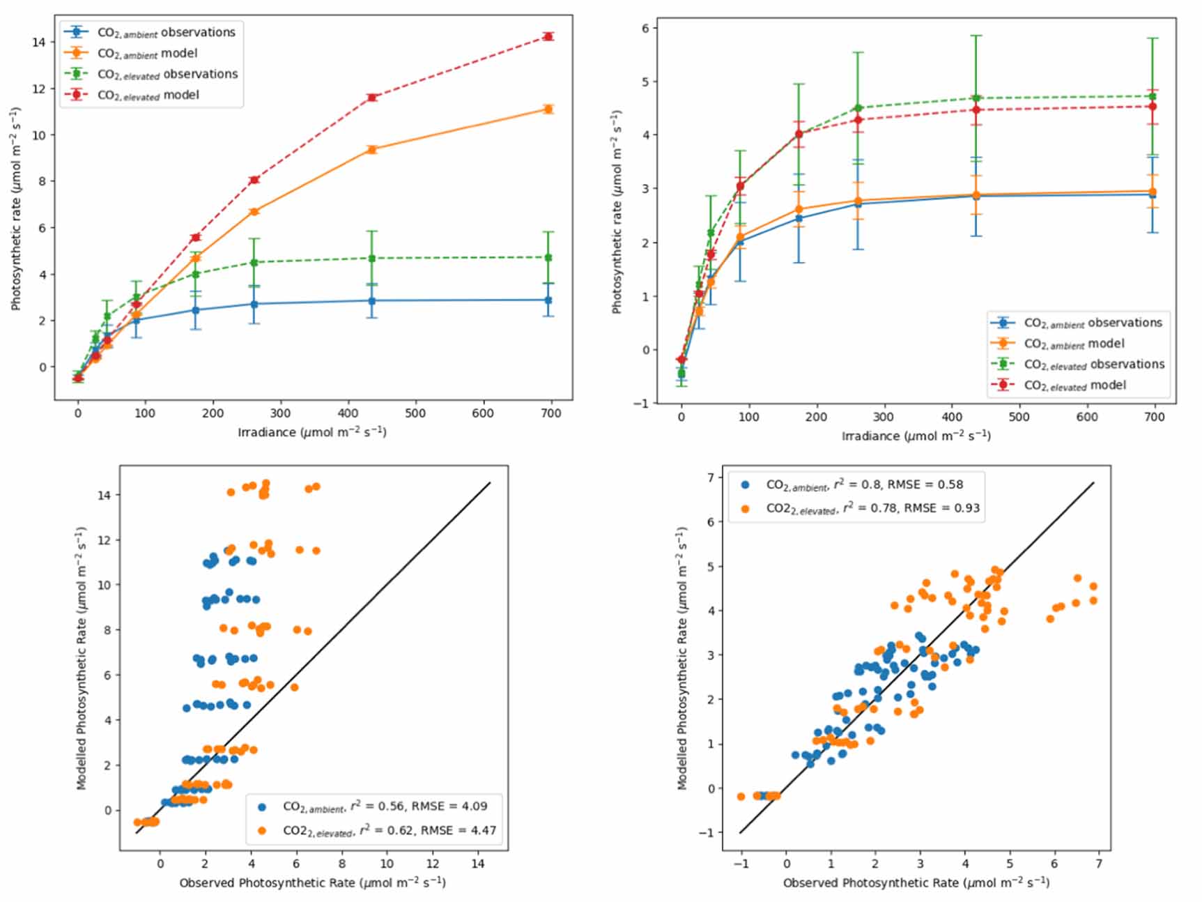 Figure 5. The effect of assimilating observations on the representation of photosynthesis: Observed and modelled photosynthesis light response curves for cocoa under 2 different CO2 regimes, vertical lines represent ± 1 standard deviation from the modelled and observed mean, before DA using default JULES parameters (top left), after assimilating observations from a leaf chamber attached to an infrared gas analyser and optimising 8 leaf level photosynthesis parameters in JULES (top right). Observed photosynthetic rate versus JULES modelled photosynthetic rate before DA using default JULES parameters (bottom left), and after DA (bottom right).