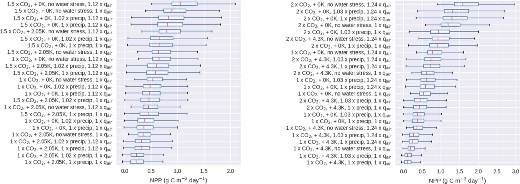 Figure 7. Box plots of Net Primary Productivity (NPP) for factorial experiments using UPSCALE present climate and varying CO2 concentration, temperature, precipitation and specific humidity: using CMIP RCP8.5 mid-century values (left), using CMIP RCP8.5 end of century values (right). The region over which the averaging is carried out is shown as a rectangle on figure 6.