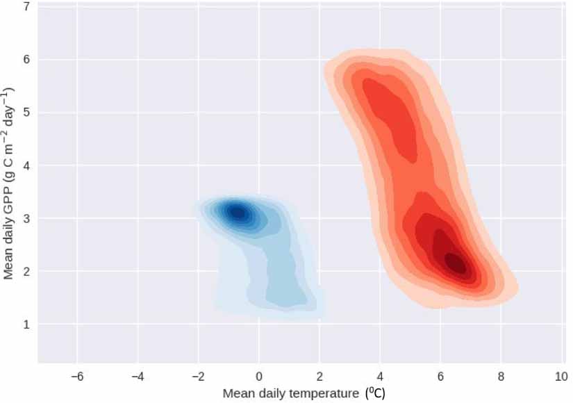 Figure 8. Plot of mean daily GPP versus daily temperature anomaly for all points in red box in figure 6. The blue and red shading indicates where the majority of points are for different combinations of mean daily GPP and mean daily temperature. Temperatures are anomalies calculated relative to the UPSCALE present day aerial mean climatology. The blue shading is for present day CO2 and the red shading is for elevated CO2.