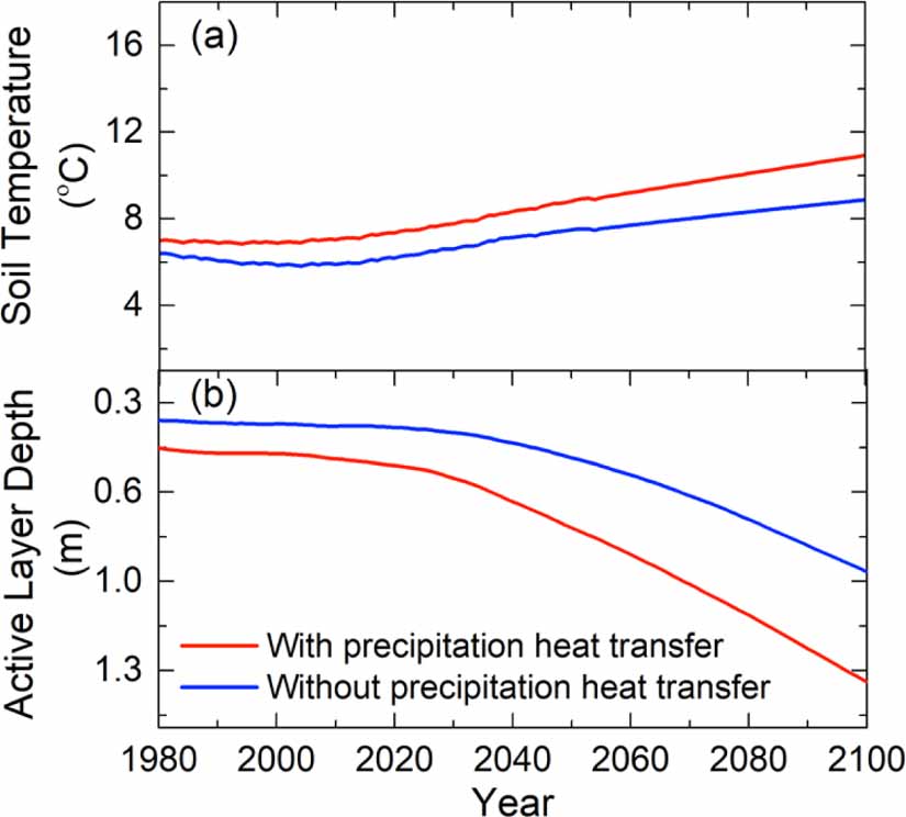 Figure 2. Precipitation heat transfer resulted in warmer soils and deeper active layers. Modeled NSA spatially averaged daily maximum 0–100 cm soil temperature (a) and ALD (b) in simulations with and without precipitation heat transfer. Lower soil temperature simulated without precipitation heat transfer led to ALD reductions of ~39 cm in year 2100.