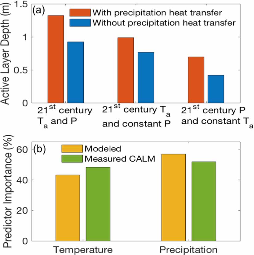 Figure 4. Precipitation is as important as surface air temperature for both modeled and measured ALD across the 28 NSA CALM sites. The sensitivity of modeled ALD to relative changes in surface air temperature (Ta) and precipitation (P) in year 2100 (a). The relative importance of mean annual Ta and P on modeled and measured ALD estimated using the GBM approach for 28 CALM sites across NSA (b). Data points for the GBM were extracted from grid cells corresponding to the location of the 28 CALM sites during years 1990–2018.