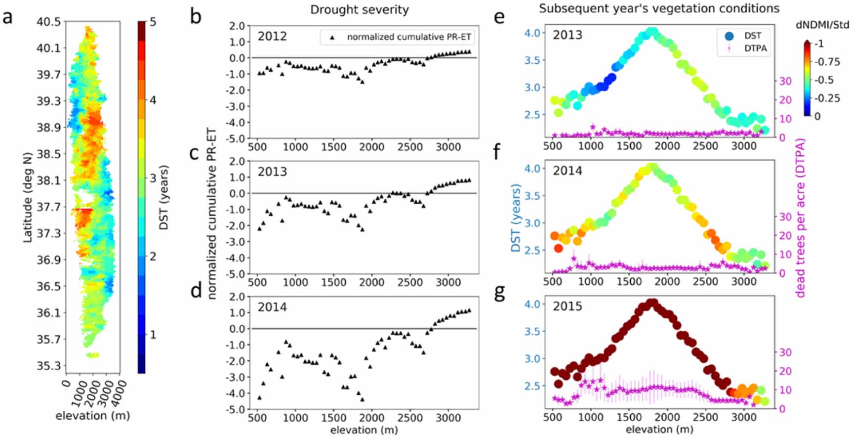 In 2013, after 1 year of drought, some elevations showed moderate vegetation stress (figure 1(e)), but no systematic relationship between DST and vegetation stress. However, as the drought lengthened, vegetation stress became most apparent at those elevations where DST is lowest and drought severity is high, i.e. orange/reddish dots in figure 1(f) (Elevations above about 2700 m are characterized by a low DST, but they did not experience severe drought and hence remained unaffected). By 2015, after an even longer period of extreme precipitation deficit (at least 3 years), even elevations with the longest DST showed signs of extreme canopy moisture loss. Only the highest elevations avoided moisture loss (figures 1(b)–(d)). Canopy moisture loss precedes tree mortality and could ultimately trigger it (Brodrick and Asner 2017, Paz-Kagan et al 2017, Goulden and Bales 2019). The predictive power of DST for vegetation conditions is apparent in directly measured tree mortality, as shown in figures 1(e)–(g). Very low tree mortality is seen in 2013, similar to the background rate (Byer and Jin 2017). By 2014 values were slightly higher for those elevations with signs of vegetation stress, and relatively low DST values (orange/reddish dots in figure 1(f)). By 2015 a dramatic increase in tree mortality is seen everywhere except the highest elevations.