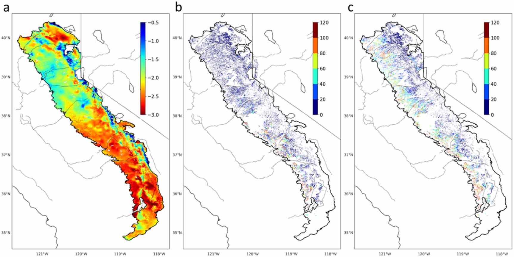 Standard image High-resolution imageFigure 2. Precipitation deficit and tree die-off in Sierra Nevada, California. (a) The 4 year Standardized Precipitation Index (SPI) of 2015. (b) Observed dead trees per acre (DTPA) during the 2012–2015 drought, calculated as the maximum number of dead trees observed at any time in areal detection surveys done by USFS during the summers of 2013–2016. (c) Dead trees per acre predicted using the random forest model (see Methods) for a 4 year drought with a uniform 4 year SPI of −2.5 over whole Sierra Nevada forests. In (b) and (c), only the regions dominated by conifers, unimpaired by wildfires, and have a statistically significant maximum correlation between NDMI and SPI at 80% are shown.