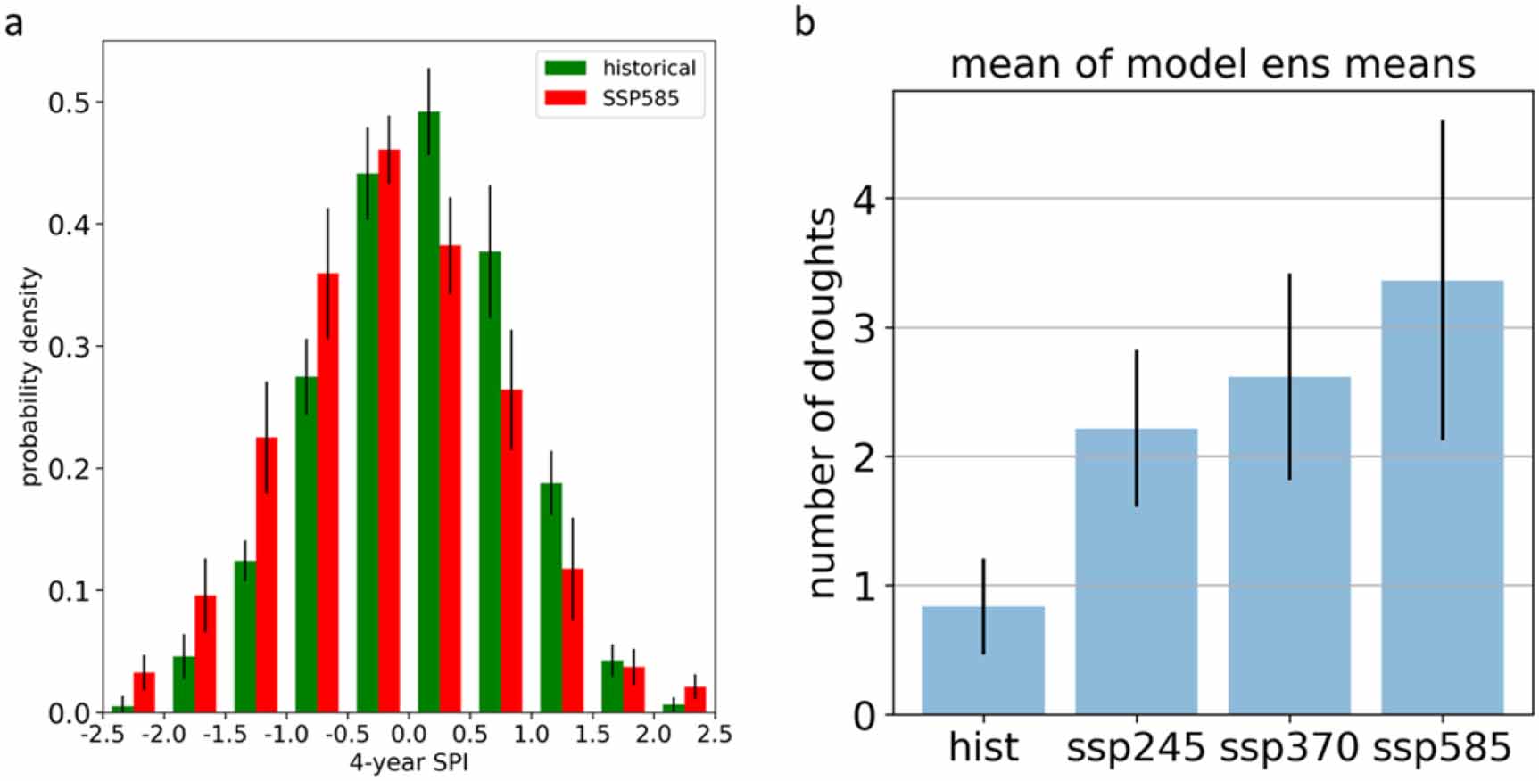 For CMIP6 ensembles, historical and future time series of each ensemble member for each grid cell were first merged to obtain a time-series spanning 1850–2100. SPI for 4 year integration periods was calculated from these time series.