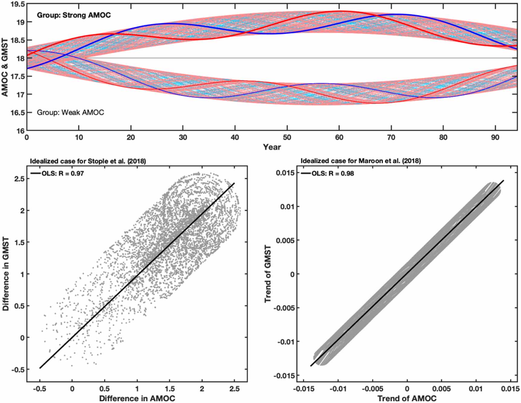 To demonstrate how results similar to Stolpe et al (2018), Maroon et al (2018), Drijfhout (2015) and others can be misinterpreted, we repeat their procedures of analyses but with synthetic time series where the AMOC cycles and GMST are known to be 90° out of phase (i.e. one is a sine and the other is a cosine of the same phase) (figure 1(a)). Each pair of AMOC and GMST has a random phase, which generates the individual ensemble members. The upper group ('strong AMOC group') rides on a positive nonlinear trend and the lower group ('weak AMOC group') rides on an equal but opposite nonlinear trend, similar to Stolpe et al (2018)'s figure 4(b). The nonlinear trend here is from a part of a long (200 year) cycle of internal variability. For such long periods, the energy balance between ocean circulation and surface temperature could be taken as at equilibrium, and these nonlinear 'trends' taken as a slowly varying mean state. Differencing the two groups doubles the trend. The correlation between the difference of GMST and the difference of AMOC found by them is mostly the correlation between the long-term 'trends', obtained by the grouping. This high positive correlation, close to 1, is also found here (figure 1(b)), even though we know the correlation between cycles of AMOC and GMST should be zero by construction. Using this same synthetic example but applying to the case of Maroon et al (2018), no difference of the two groups is taken, and only the 'strong AMOC' group is considered. Plotting 75 year trends of GMST vs AMOC in figure 1(c) again shows a high positive correlation, again close to 1, even though we know the actual cycles should have zero correlation. These results show how such claimed positive correlation between AMOC and GMST can be misinterpreted.