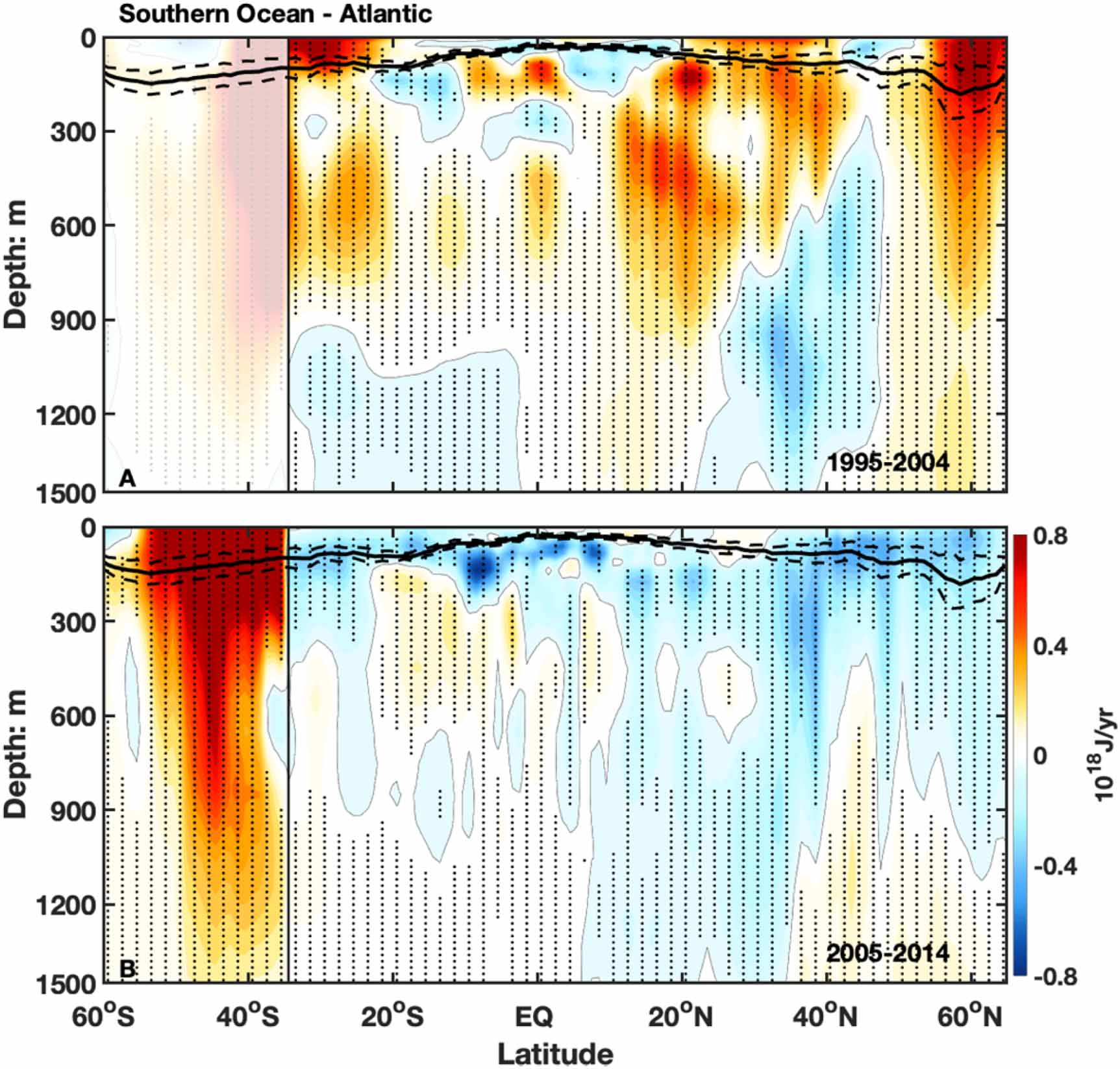Subsurface meridional cross-section of the zonally averaged OHC linear trends in the Atlantic and the Southern Ocean are shown in figure 4, for the period when AMOC was increasing (4A) and when it was declining (4B). Note that linear trends show rate of change, and not the anomaly. This figure is similar to figure 4 in Chen and Tung, except zonal integral instead of zonal average is used here, and the mixed layer depth is superimposed. Adding up zonal integrals gives directly the contribution to the total OHC, already taking into account the different zonal widths of the Atlantic basin at each latitude.