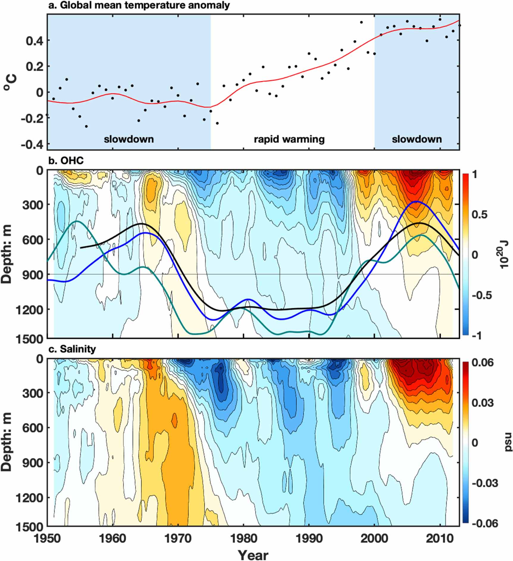 Figure 5. Coincidence of the three AMOC phases with global warming slowdown and acceleration. (a) Global mean surface temperature. Black dots are annual mean values, and the red curve is smoothed version using EMD, same as in figure 2. (b) OHC north of 45° N in the Atlantic. Shown are averaged OHC in 5 m resolution in depth. (c) Salinity north of 45° N in the Atlantic. In (b) three AMOC proxies are superimposed: blue: Ishi + Scripps salinity proxy (Chen and Tung 2018); green: Subpolar SST index (Caesar et al 2018); black: subsurface fingerprint (Zhang 2008). Surface temperature data extends to 2017, but only up to 2012 is displayed. Modified and updated from the Extended Data Figure 3 of Chen and Tung.