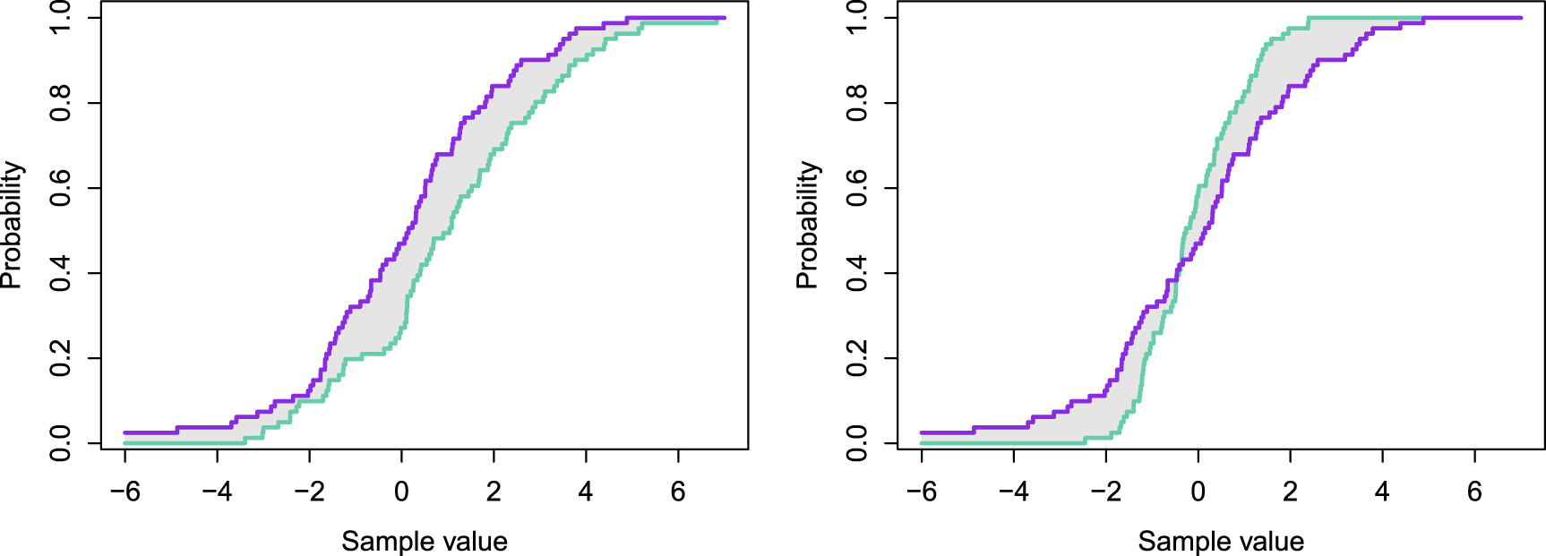 Figure 1. ECDFs of samples from two normal distributions with either different means but same spread (left), or same mean but different spreads (right). The IQD performance metric calculates the squared area (indicated in gray) between the two distributions, see the main text for more details.