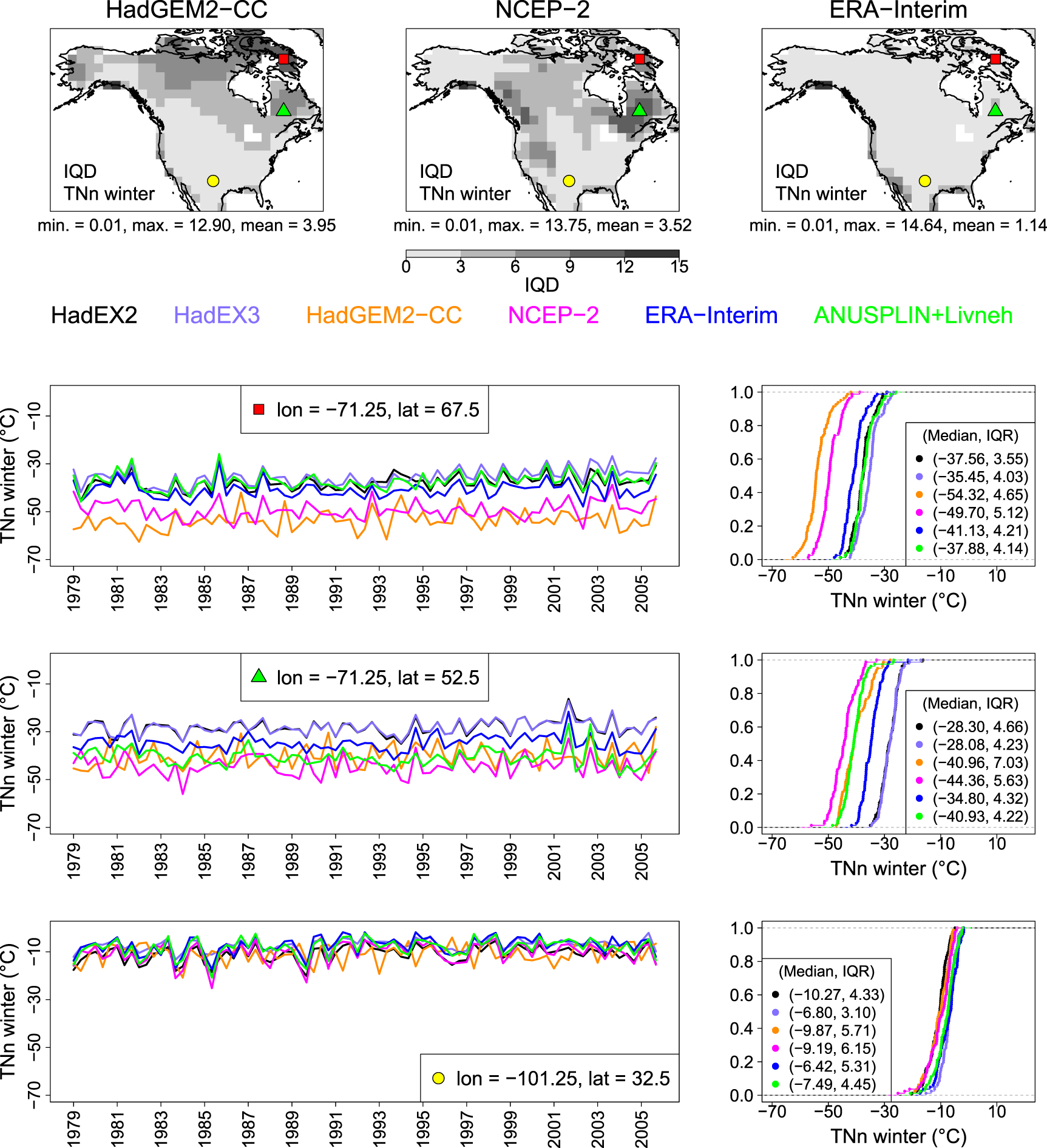 Figure 3. Top panel: IQD scores for evaluation against HadEX2 for winter TNn from 1979-2005 across grid locations in North America for the model/reanalysis simulations listed on top of each plot. Minimum (best), maximum (worst) and mean IQD values over the area are given below each plot. Panels two to four: Time series and distribution functions over the study period for six different data sets at three locations indicated on the maps in the top panel, with the median and the interquartile range (IQR) of each distribution. The name of each data set is given above panel two in the corresponding color used in the plots below.