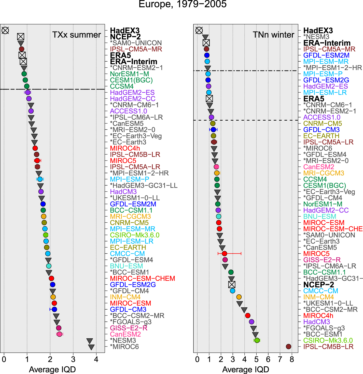 Figure 4. Average IQD over grid points in Europe for an evaluation against HadEX2 for TXx distributions in summer (left) and TNn distributions in winter (right) from 1979-2005: Reanalyses (squares with (x), observation-based data sets (circles with (x), CMIP6 models (gray triangles) and CMIP5 models (filled circles). The models are ranked with the best performing model at the top. CMIP5 models are sorted in model families by color according to Knutti et al (2013), CMIP6 models are indicated with a star and reanalyses/data products in bold. If a model has multiple runs, the spread across the runs is indicated with a bar. Horizontal lines indicate the 5% significance level of testing equal performance to ERA5 (dashed) and ERA-Interim (two-dash). In the figure on the left the lines are on top of each other.