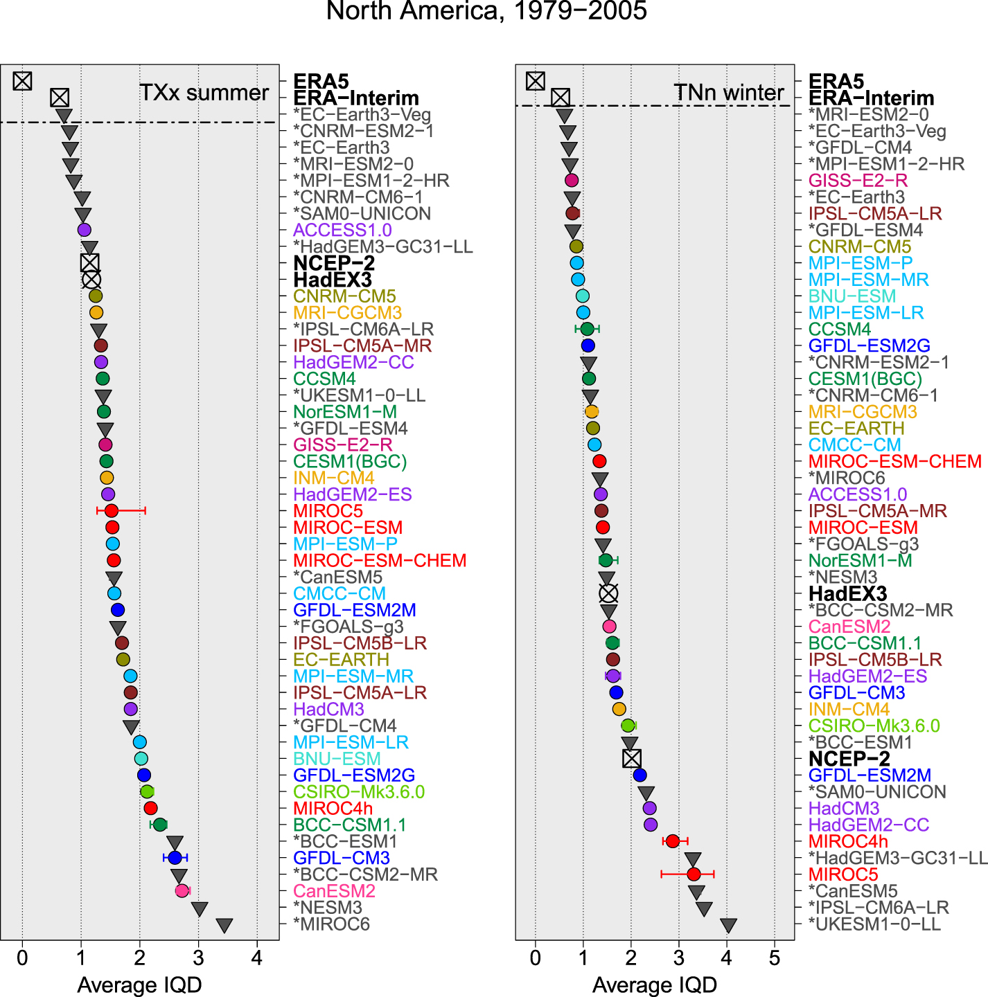 Figure 6. Average IQD over grid points in North America for an evaluation against ERA5 on the HadEX2 grid for TXx distributions in summer (left) and TNn distributions in winter (right) from 1979–2005: Reanalyses (squares with (x)), observation-based data sets (circles with (x)), CMIP6 models (gray triangles) and CMIP5 models (filled circles). The models are ranked with the best performing model at the top. CMIP5 models are sorted in model families by color according to Knutti et al (2013), CMIP6 models are indicated with a star and reanalyses/data products in bold. If a model has multiple runs, the spread across the runs is indicated with a bar. Two-dash horizontal lines indicate the 5% significance level of testing equal performance to ERA-Interim.