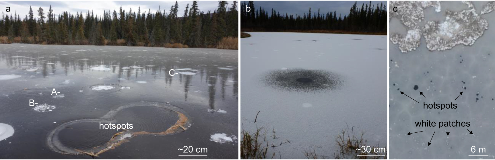 Figure 2. Photographs of CH4 ebullition hotspot seeps in interior Alaska yedoma thermokarst lakes. In (a), ice-free hotspot ebullition seeps are shown in early winter prior to snowfall among other smaller seeps (A-, B-, and C-type seeps), the bubbles of which are seasonally trapped by winter lake ice and appear as white patches. In (b), a dusting of snow covers the lake ice surface, largely masking the smaller ice-trapped bubbles, but exposing with strong color contrast the open-hole CH4 hotspot seeps. The dark, round features in panel (c) are hotspot ebullition seeps as seen in aerial photographs; white patches are smaller A-, B- and C-type seeps. Photo credit: (a) Katey Walter Anthony, October 2016; (b) Guido Grosse, October 2011; and (c) Jessica Cherry, October 2014.