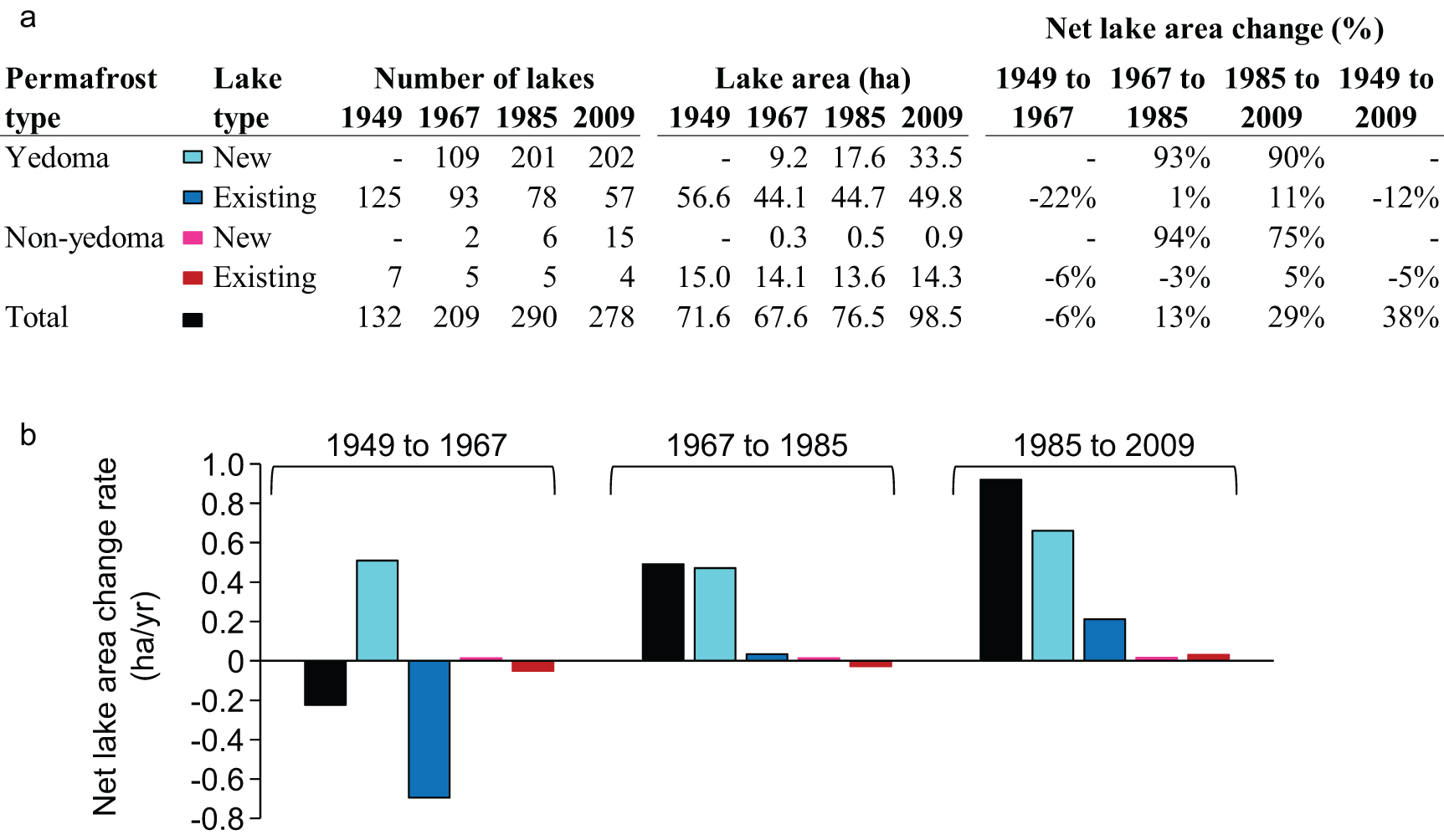 Figure 3. Multi-temporal changes in the number and area of lakes in the 214 km2 interior Alaska study extent from 1949 to 2009 for new and existing lakes formed in yedoma and non-yedoma permafrost types. Panel (a) shows the number, area, and percent change in net lake area; panel (b) shows the rate of change for different classes of lakes calculated as the net change divided by the number of years across the three intervening study periods.