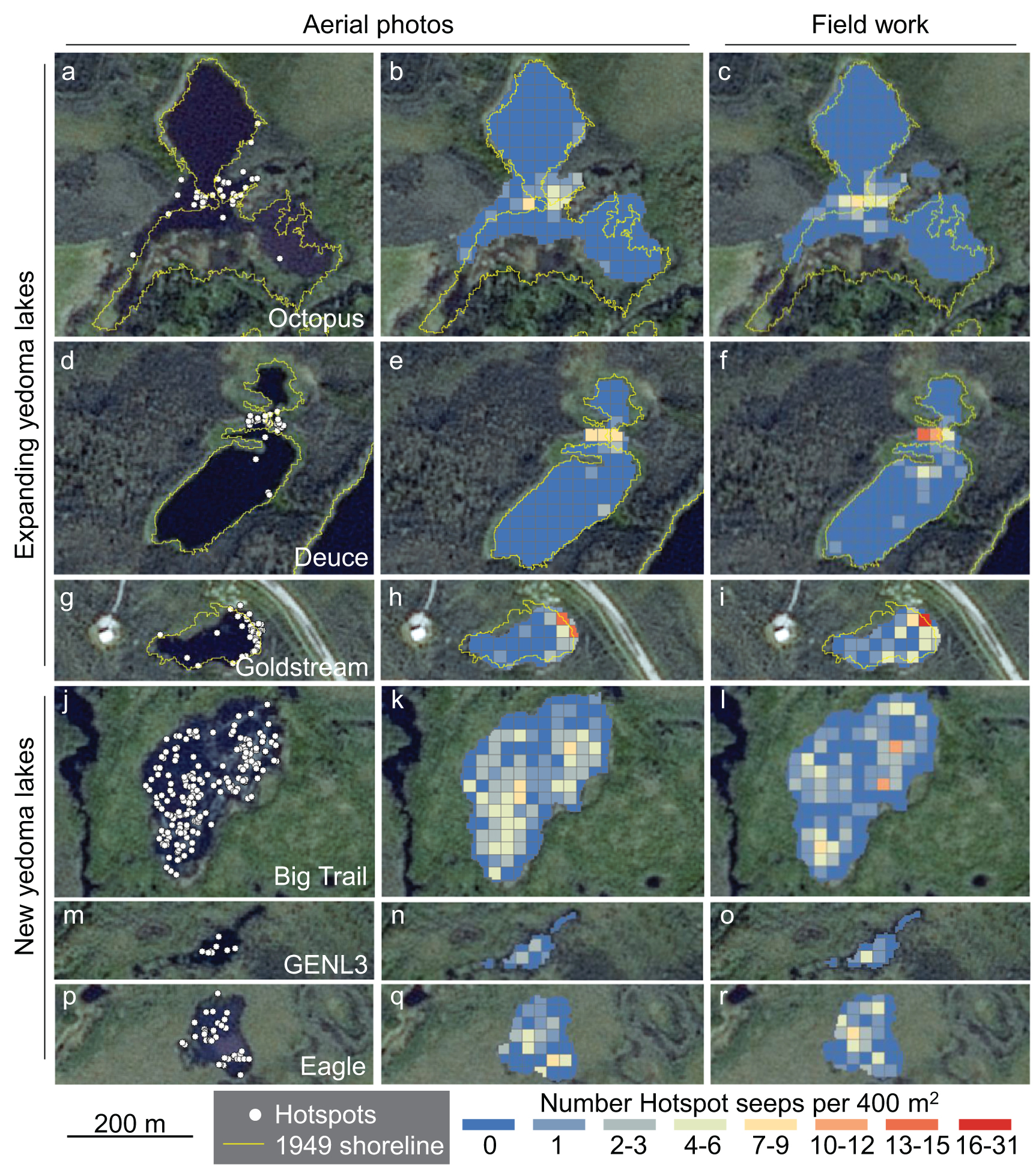 Figure 6. Examples of CH4 hotspot-seep patterns in two interior Alaska yedoma lake classes: Expanding lakes (a)–(i) and new thermokarst lakes (j)–(r). Despite significant lake area loss along some shorelines of lakes existing in 1949 (e.g. Octopus L., Goldstream L.), these lakes were categorized as 'expanding' due to our focus on relating CH4 ebullition to those shorelines that did expand. Left-column panels show locations of hotspot seeps (white dots) mapped from high resolution aerial photos obtained on 8 October 2014. Yellow lines are the 1949 shorelines shown on top of 2009 SPOT imagery. Hotspot seep densities in 400 m2 pixels are shown based on aerial photo analysis (middle column panels) and ground-based field surveys (right column panels). See supplementary figures 3–5 for additional lakes.