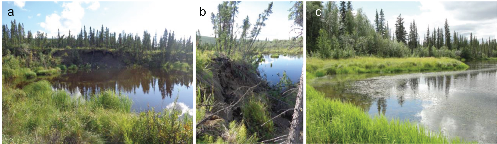 Standard image High-resolution imageFigure 7. Photographs showing examples of eroding thermokarst margins (a), (b) and a stable margin (c) in interior Alaska thermokarst lakes. Photo credit: Katey Walter Anthony.