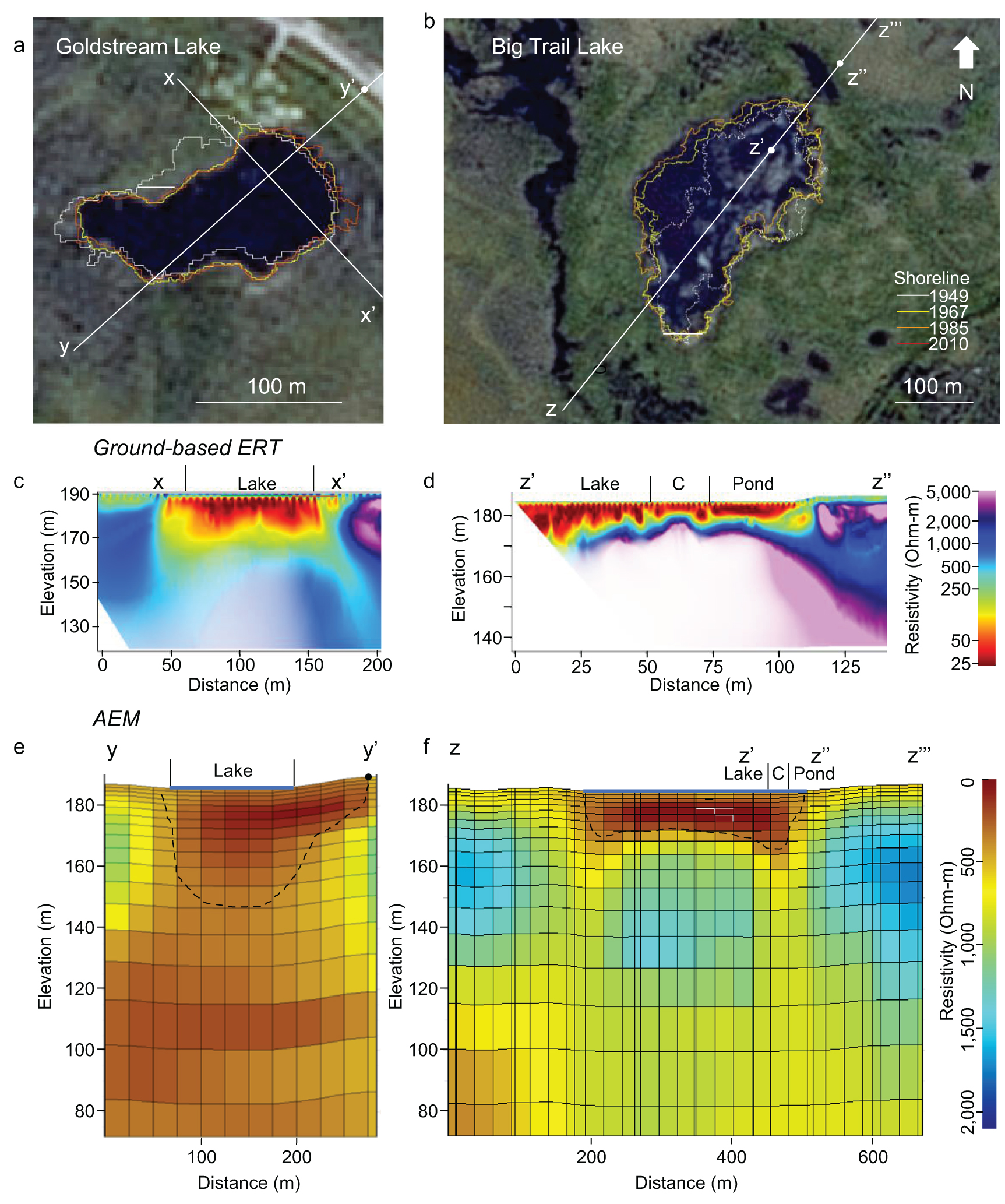 Figure 9. Geophysical measurements of talik profiles beneath two interior Alaska thermokarst lakes. The locations of ground-based ERT and AEM transect data are shown for Goldstream Lake (average depth 1.9 m, max depth 4.4 m) (panel a) and Big Trail Lake (mean depth 1.2. m, max depth 4.1 m) (panel b). In (a) and (b), historical 1949 shorelines are white (dashed white line in (b) indicates vegetated wetland) and shown on top of the 2009 SPOT image. Panels (c) and (d) are ground-based ERT profiles. Panels (e) and (f) are helicopter-borne AEM profiles; black dashed line is talik depth. Consistent with the AEM profile, a separate ground-based ERT transect measured perpendicular to z'-z'' indicated >15 m thaw beneath the narrow channel (C) connecting Big Trail Lake to the adjacent thaw pond (data not shown).