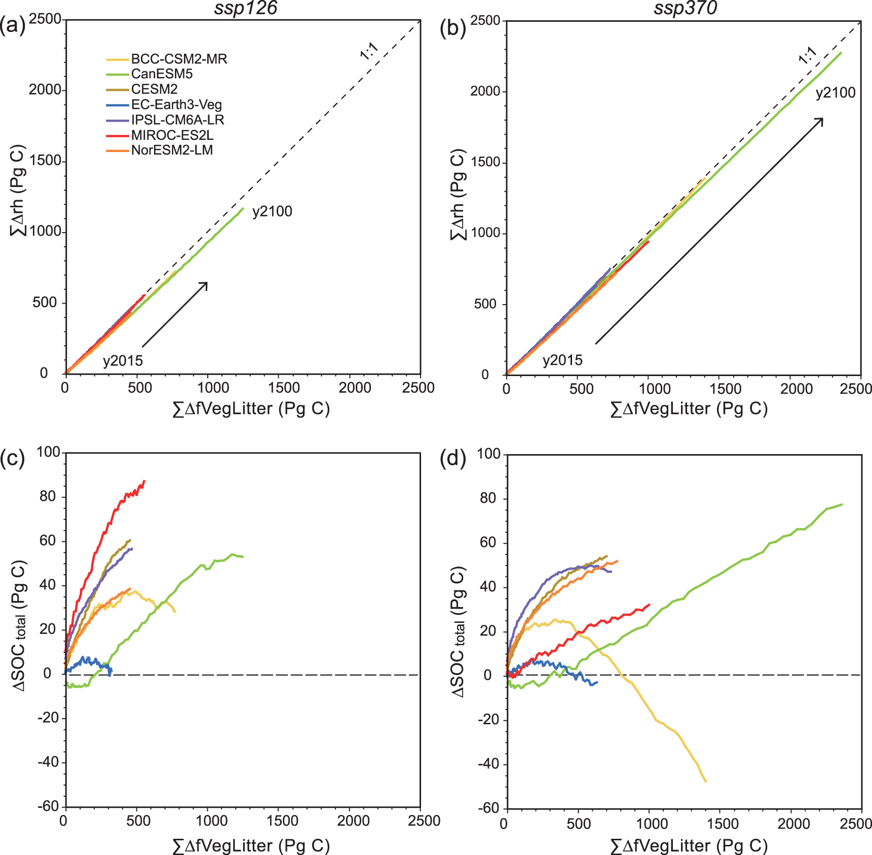 Figure 8. Relationships between cumulative changes in carbon input by litterfall (fVegLitter) and (a), (b) carbon output as heterotrophic respiration (rh) or (c), (d) soil carbon (SOC) stock in the (a), (c) ssp126 and (b), (d) ssp370 experiments. The change term (Δ) is defined as the difference from the 2000s mean, and ∑ represents the accumulation from 2015 to 2100.