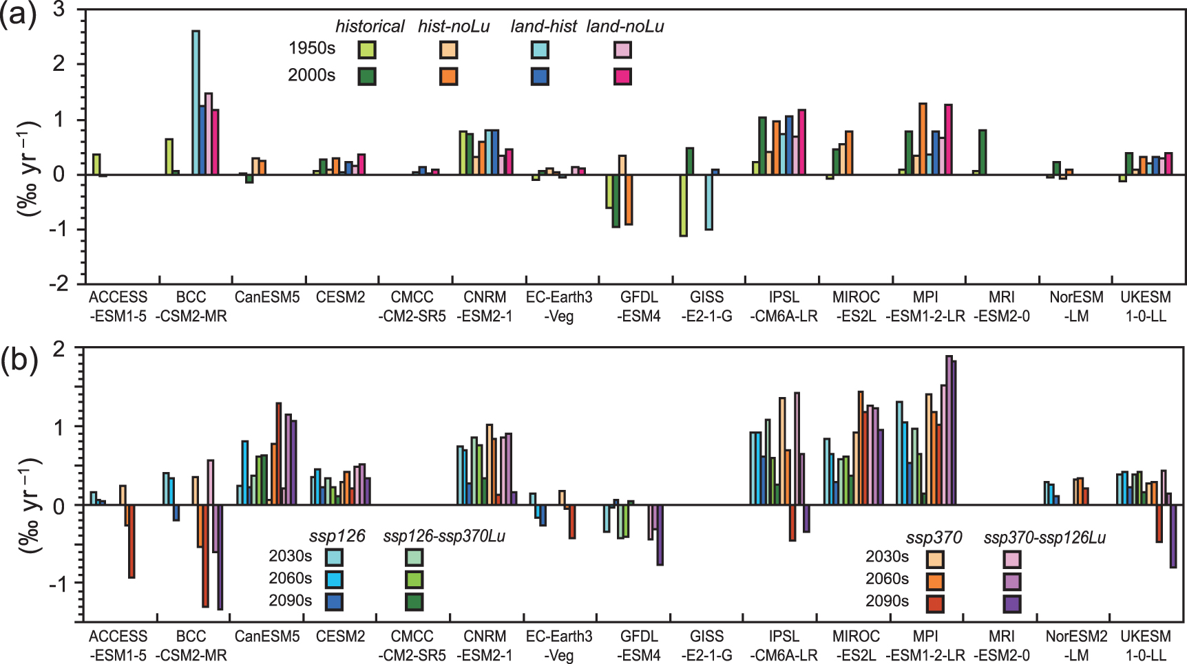 Figure 9. Relative change rates of global soil carbon (SOC total) storage simulated by the LUMIP experiments. Rates in (a) the 1950s and 2000s in the historical experiments and (b) the 2030s, 2060s, and 2090s in the future projection experiments. See figure S8 for results for the northern mid-latitudes and tropics.