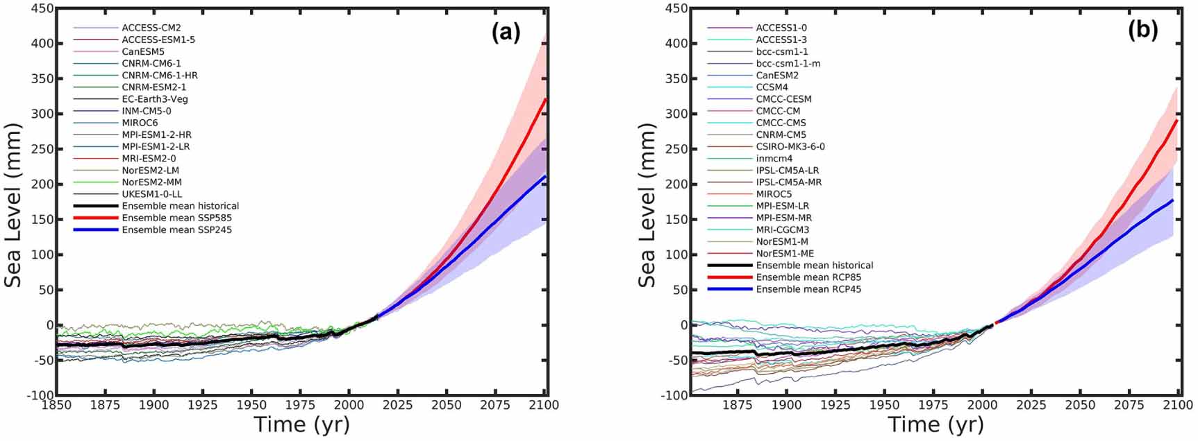 Figure 1. GMTSL (zostoga) for (a) CMIP6 and (b) CMIP5 models from 1850 to 2100 (relative to 1995–2014) using two future scenarios SSP245/RCP4.5 (blue) and SSP585/RCP8.5 (red). Model ensemble mean for 'historical' period is thick black line. Model ensemble mean for SSP585/RCP8.5 and SSP245/RCP4.5 are thick red and blue lines respectively. Shaded areas represent 5–95th percentiles of model ensembles.