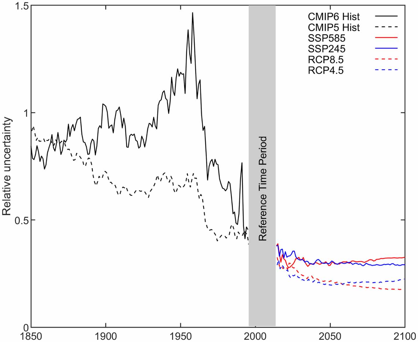 Figure 3. Relative uncertainty, calculated as the ensemble variance divided by the median through time, of CMIP6 and CMIP5 GMTSL for historical and projected periods.