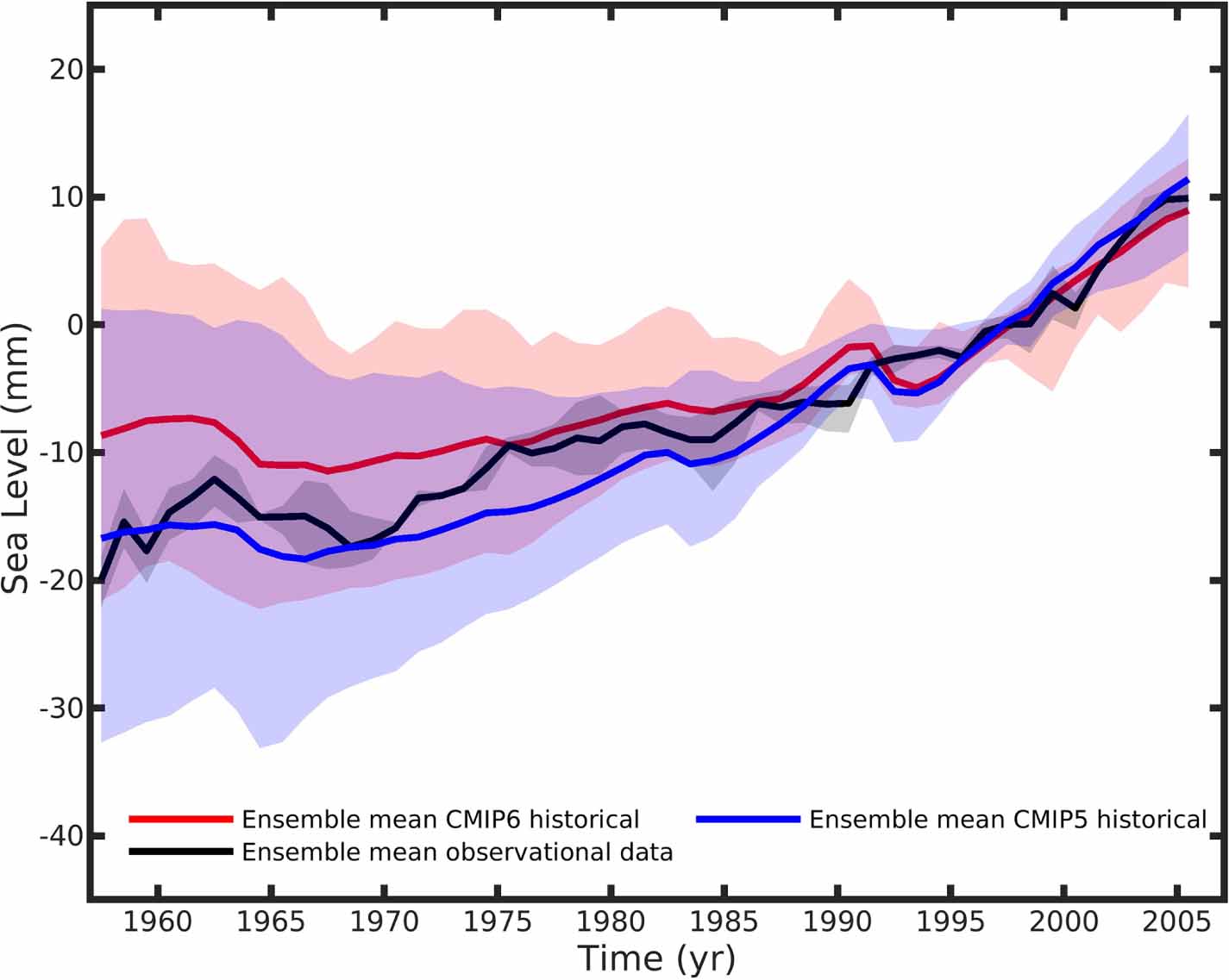 Figure 4. Comparison of CMIP6 and CMIP5 MEMs with ensemble mean observational GMTSL over 1957–2005. The time series have been referenced over 1986–2005. Deep ocean contribution of 0.1 ± 0.1 mm yr−1 (available over the period 1990–2000 only), estimated by Purkey and Johnson (2010), is not included in observational GMTSL.