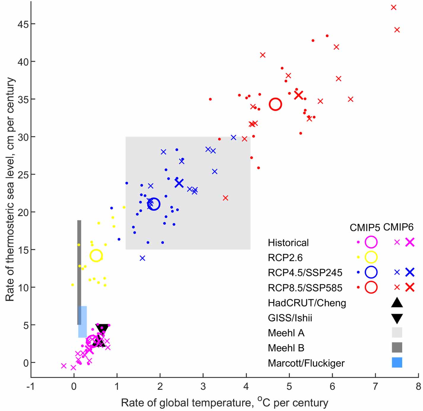 Figure 5. Global mean thermosteric sea level sensitivities (as rate in cm per century) to changes in global surface temperature (°C per century) from model and observational data. Individual models/MEM results for CMIP6 (x/X) and CMIP5 (•/O) for past (1901–1990, magenta) and future (2015–2100) scenarios RCP2.6 (yellow), SSP245/RCP4.5 (blue) and SSP585/RCP8.5 (red). Observational sensitivities (black triangles) using temperature/thermosteric sea level reconstructions (HadCRUT4/Cheng et al 2017 and GISTEMP/Ishii and Kimoto 2009). Initial (2000–2100, Meehl A, light grey) and long run (2100–3000, Meehl B, dark grey) sensitivity of climate model simulations under SRES A1B from Meehl et al (2007). Sensitivities estimated during early deglacial conditions (light blue) from global temperature reconstruction (Marcott et al 2011) and North Atlantic hosing experiments (Fluckiger et al 2006).
