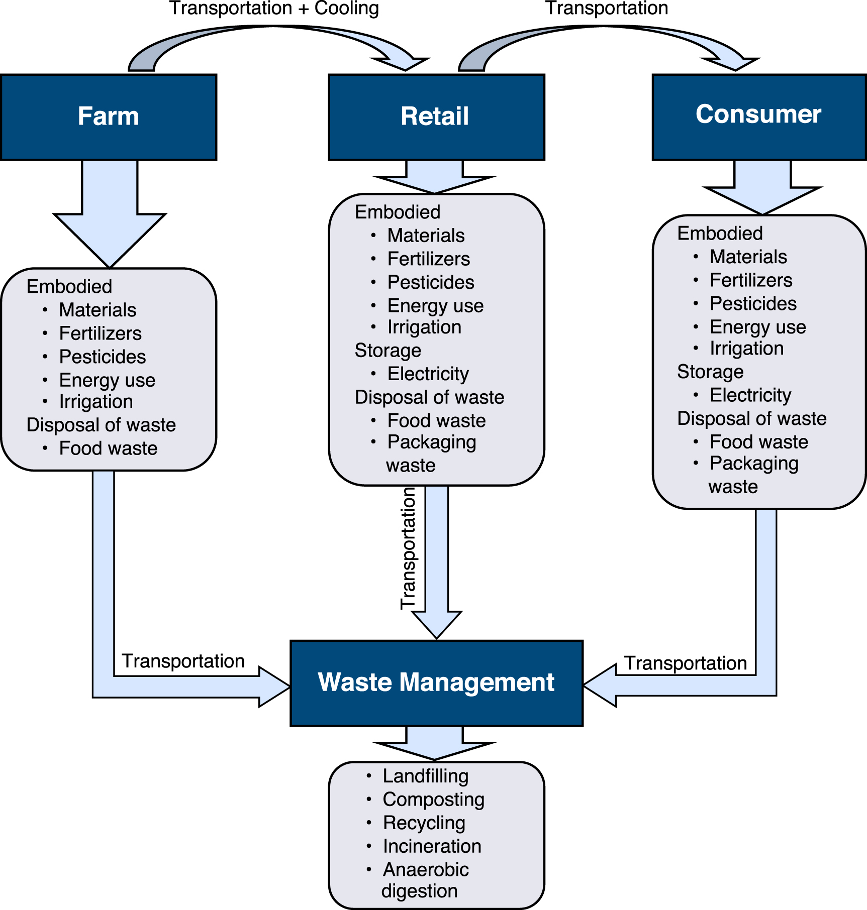 Food loss should be estimated from harvest to final consumption in the food life cycle [6]. In this study, we analyze five stages—production, delivery, retail sales, consumption at home, and waste management—and describe a life-cycle method to analyze food loss using empirical data on high-value produce to demonstrate how food loss contributes to the total environmental impact. To our knowledge, this study is the first to quantify the life-cycle GHG emissions of food and food waste along the entire food supply chain from farm-to-retail operations and then to the individual consumer, and apply practical waste management options to food and packaging wastes.