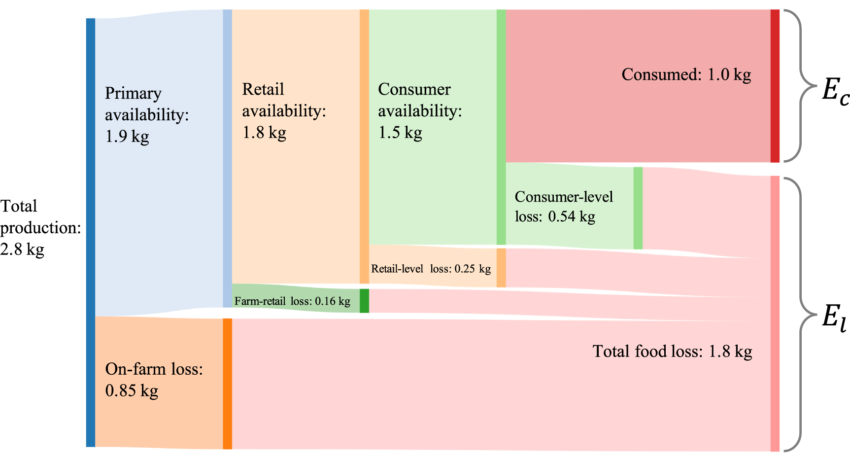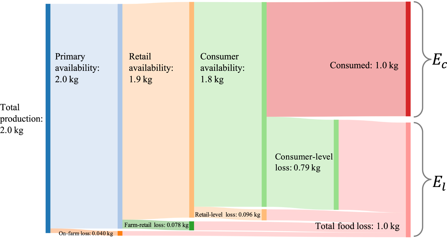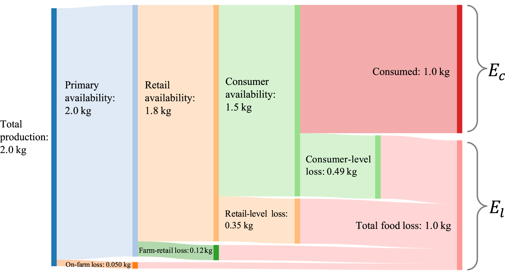 The food loss ratios at each phase are summarized in table 3. The food loss ratio is defined as the ratio of wasted food to food available for final consumption. The on-farm food loss ratio represents the produce left on the field after harvest as a proportion to the food intended for human consumption. The farm-to-retail food loss ratio denotes the ratio of food lost before retail to the food sold at the farm. The retail-level food loss ratio represents the rate of unsold food to total food for sale. The consumer-level food loss ratio is the percentage of uneaten food to purchased food.