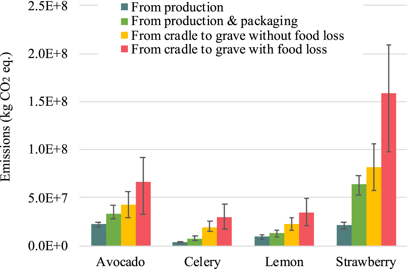 Figure 7. GHG emissions of avocados, celery, lemons, and strawberries were based on California's consumption in 2017 under four emissions scenarios. 'Production' represents the emissions from on-farm production; 'production and packaging' represents the emissions from on-farm production and packaging materials; 'cradle to grave without food loss' represents the emissions from on-farm production, packaging materials, transportation, and refrigeration; 'cradle to grave with food loss' represents the emissions from on-farm production, packaging materials, transportation, refrigeration, food and packaging waste management, and food loss. Error bars represent 95% uncertainty ranges from Monte Carlo simulations.
