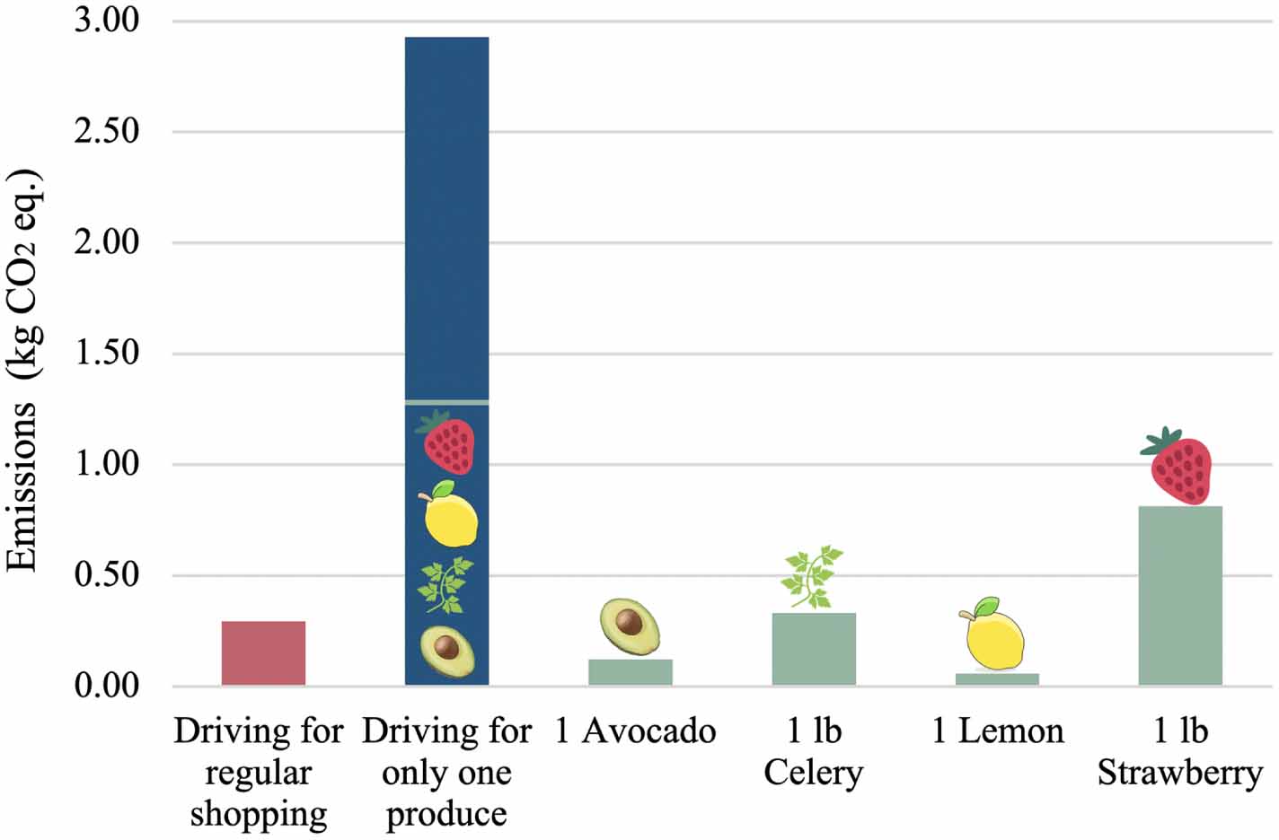 In our calculation of cradle-to-grave emissions of food consumption, emissions associated with driving from retail to home were not included. To compare the total calculated emissions for the produce with the emissions from driving to purchase them, we allocated 10% of the emissions from driving to each food item. We also calculated the emissions from driving when only one produce is purchased.
