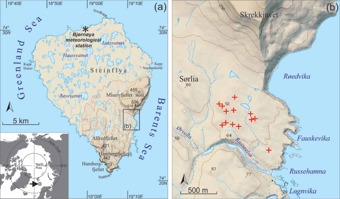 Figure 1. Location of the Bear Island in the Arctic region and location of the detailed research area in the south-eastern part of the island (a) and detailed map with location of sampling sites (red crosses) (b) (base map reproduced from Norwegian Polar Institute. Copyright © Norwegian Polar Institute. toposvalbard.npolar.no).